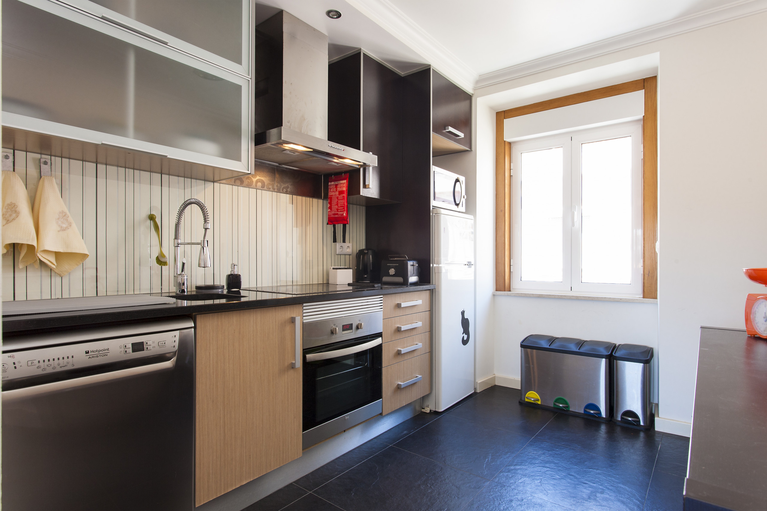 A cozinha, está equipada com frigorífico, microondas, forno, congelador, máquina de lavar roupa, máquina de lavar louça, louça/talheres, utensílios/cozinha, cafeteira e jarro eléctrico.