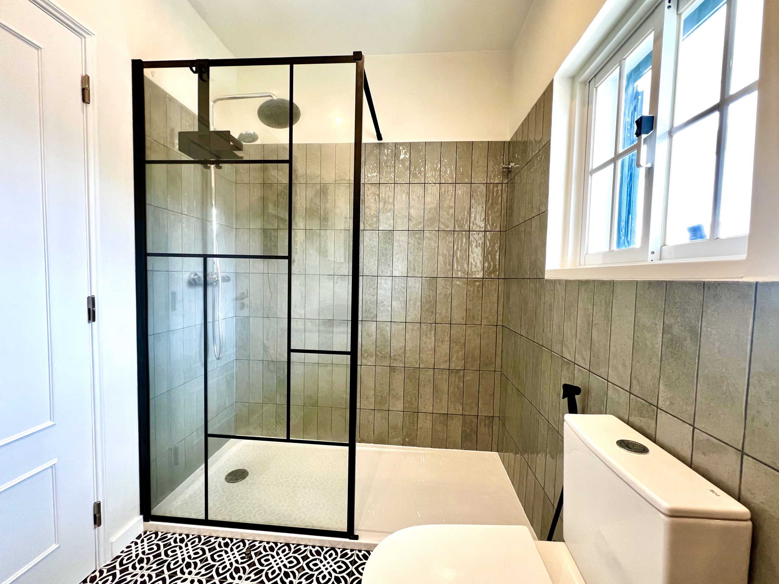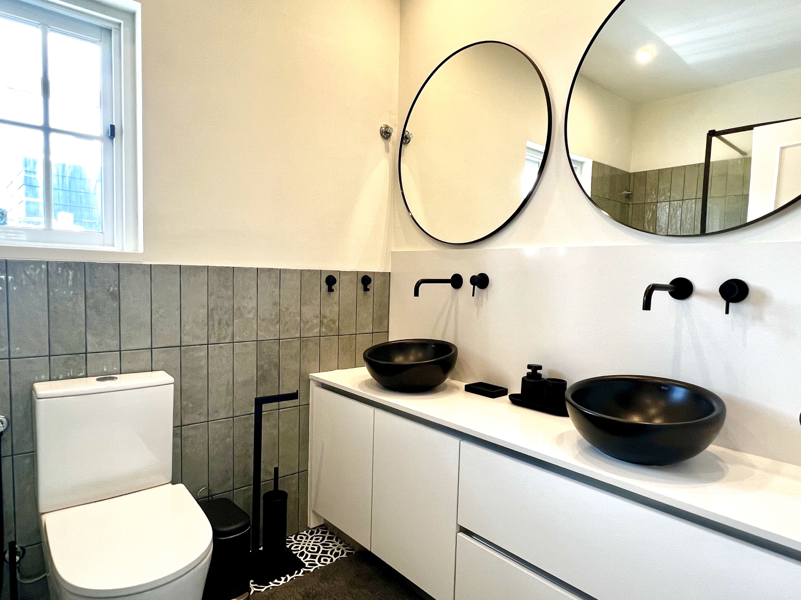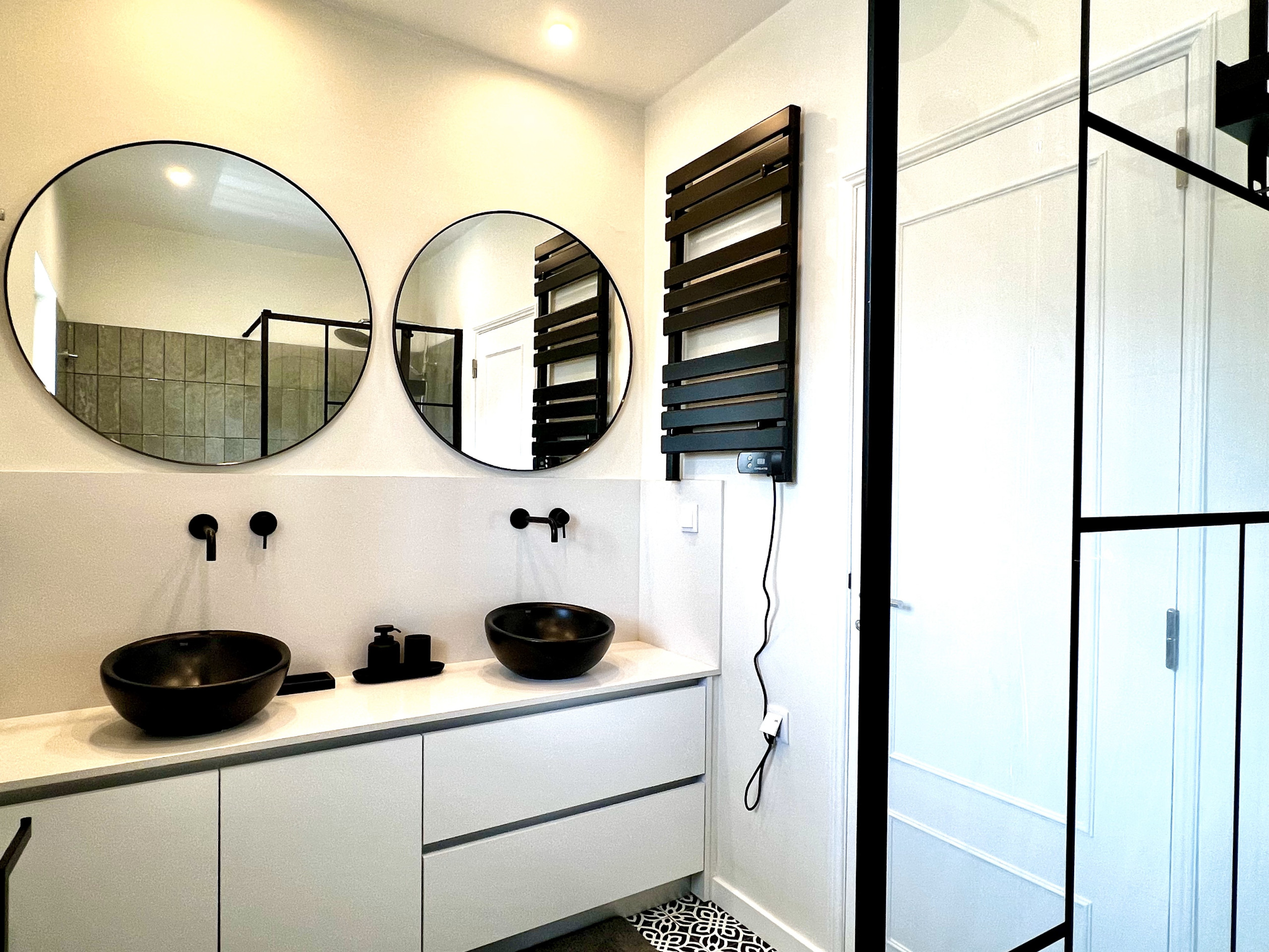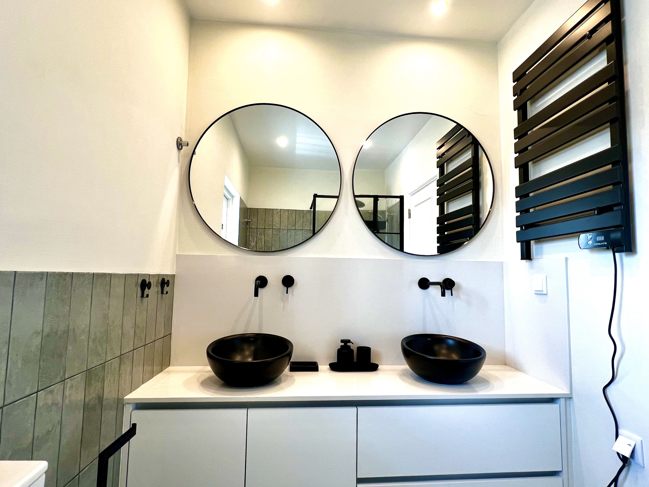A moderna casa de banho tem uma base de chuveiro e dois lavatórios.