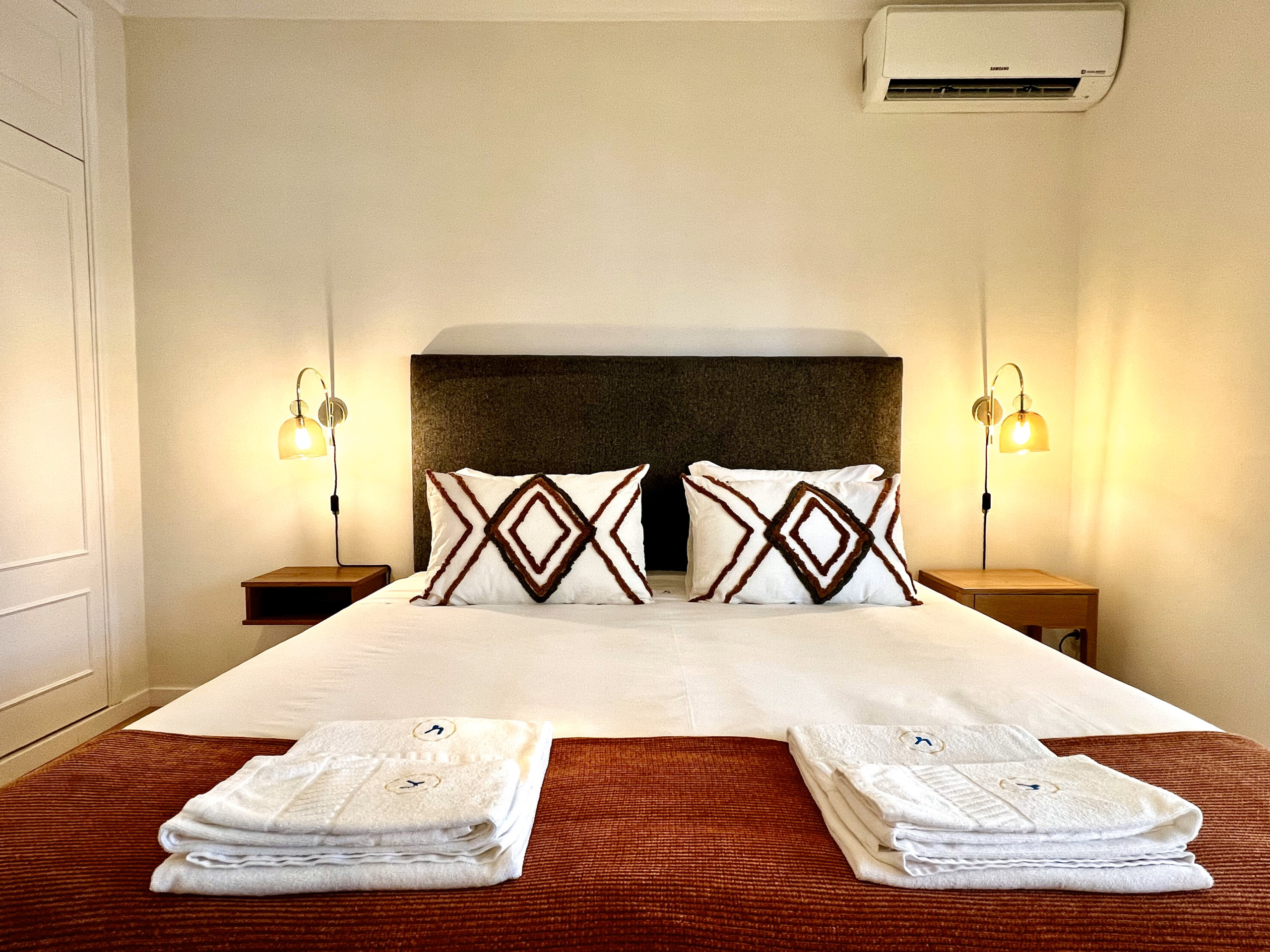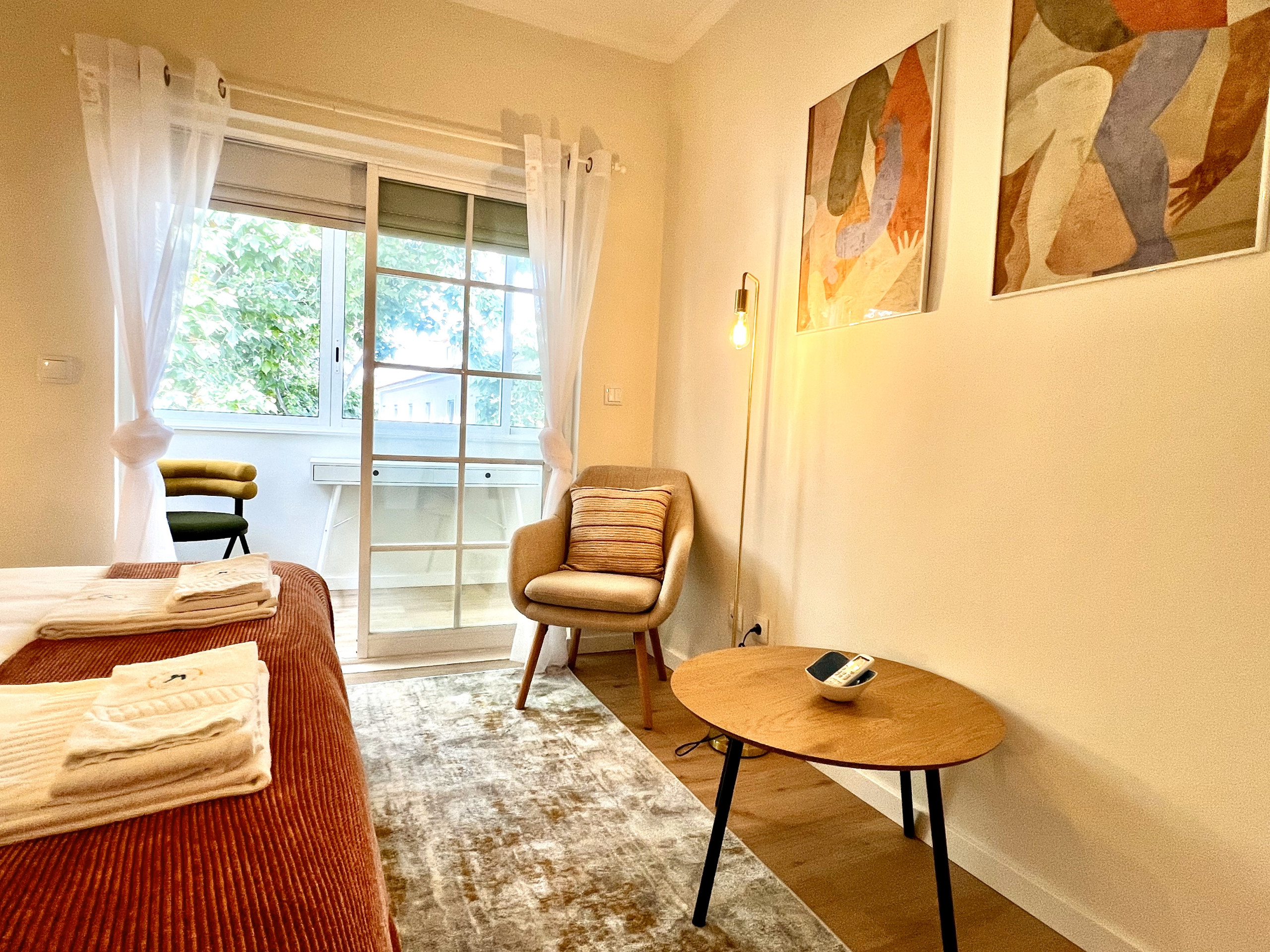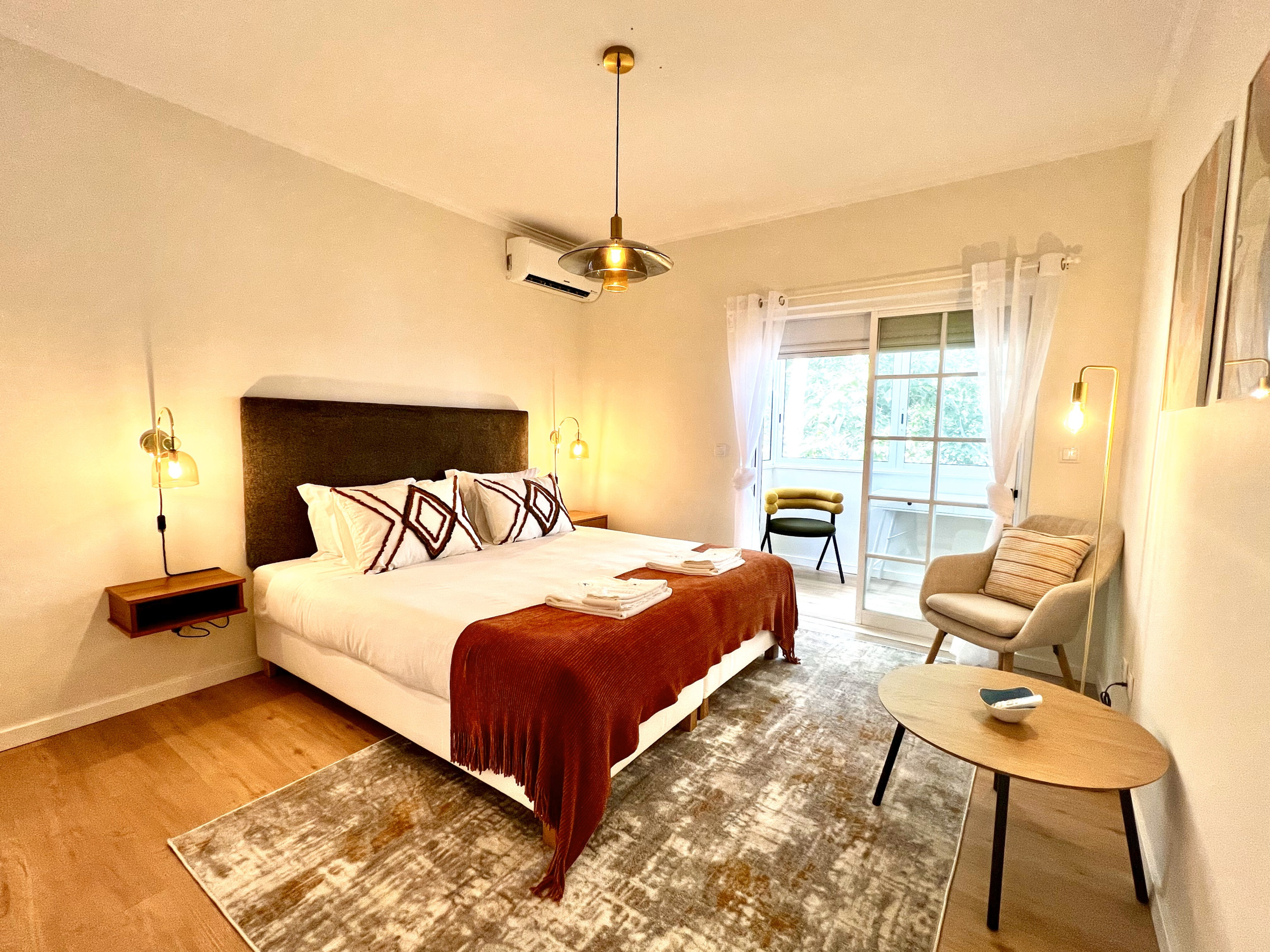 No quarto existe uma cama casal, um amplo roupeiro, uma poltrona e uma pequena mesa. Junto ao quarto, encontra-se uma secretária e uma cadeira, muito útil caso a sua estadia seja por motivos de trabalho.
