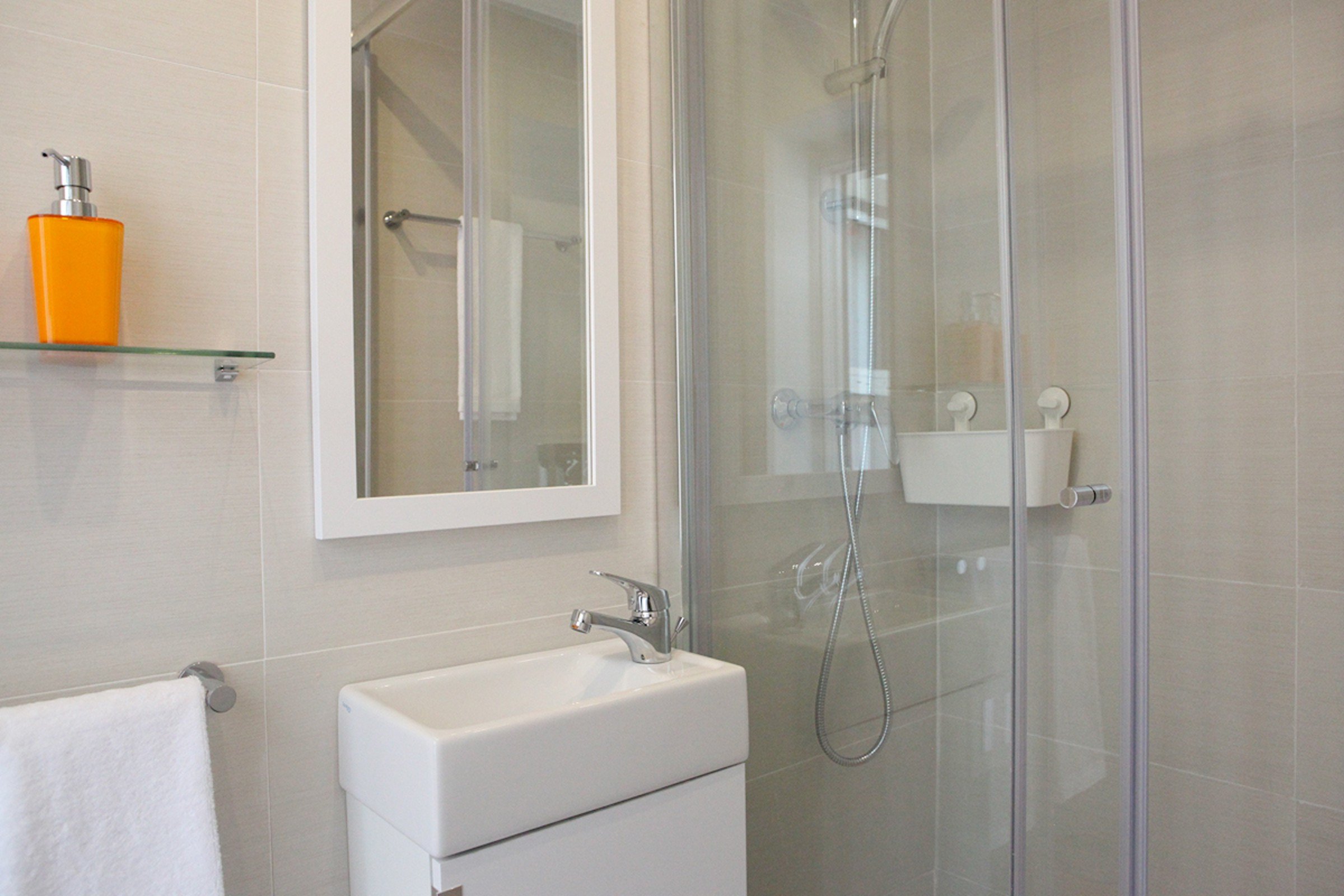Ao longo do corredor encontram-se os dois quartos. Um quarto tem uma cama de casal, e o outro quarto tem duas camas de solteiro. Existem duas casas-de-banho, uma no corredor com banheira e chuveiro e outra na varanda ao lado do segundo quarto com um chuveiro.