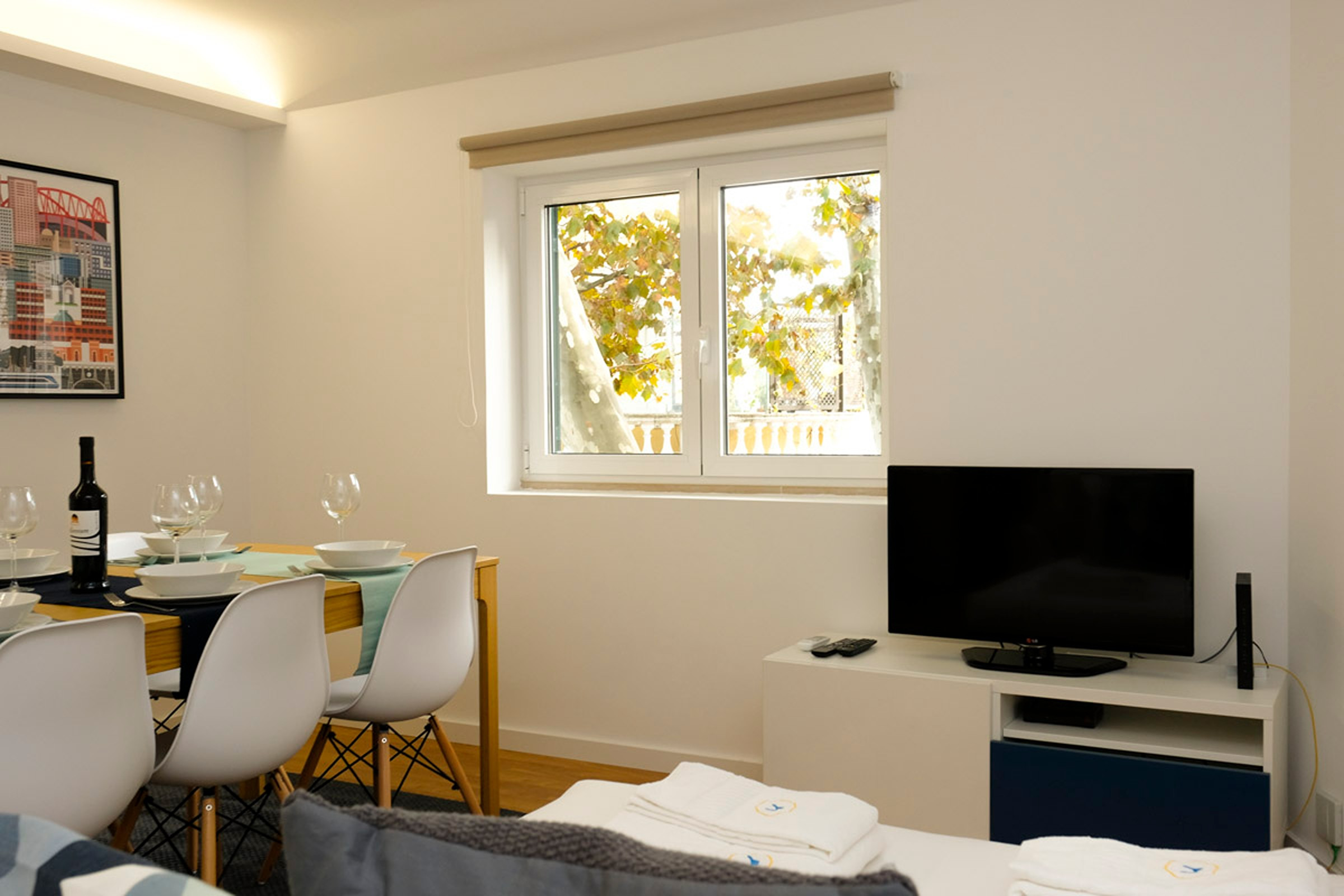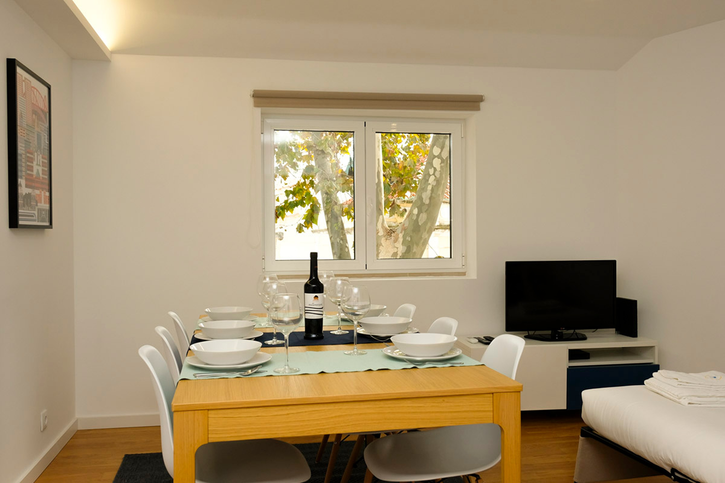 A sala tem muita luz e está decorada com muito carinho. Dispõe de uma mesa para 7 pessoas, e uma zona de estar com sofá e cadeirões e uma TV.