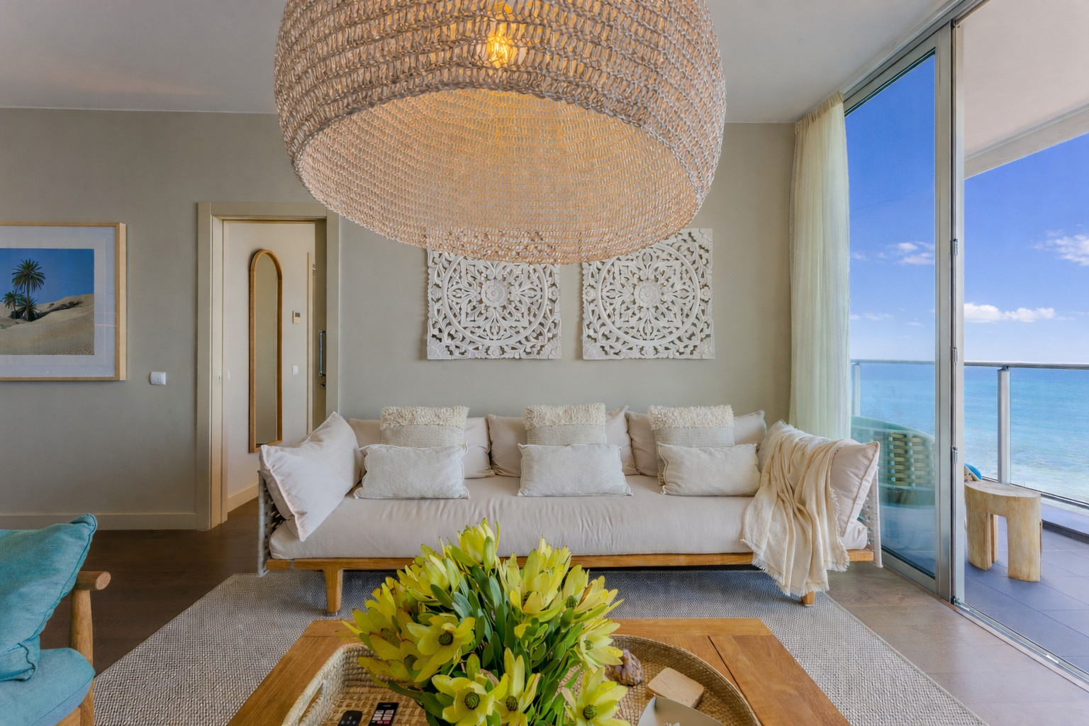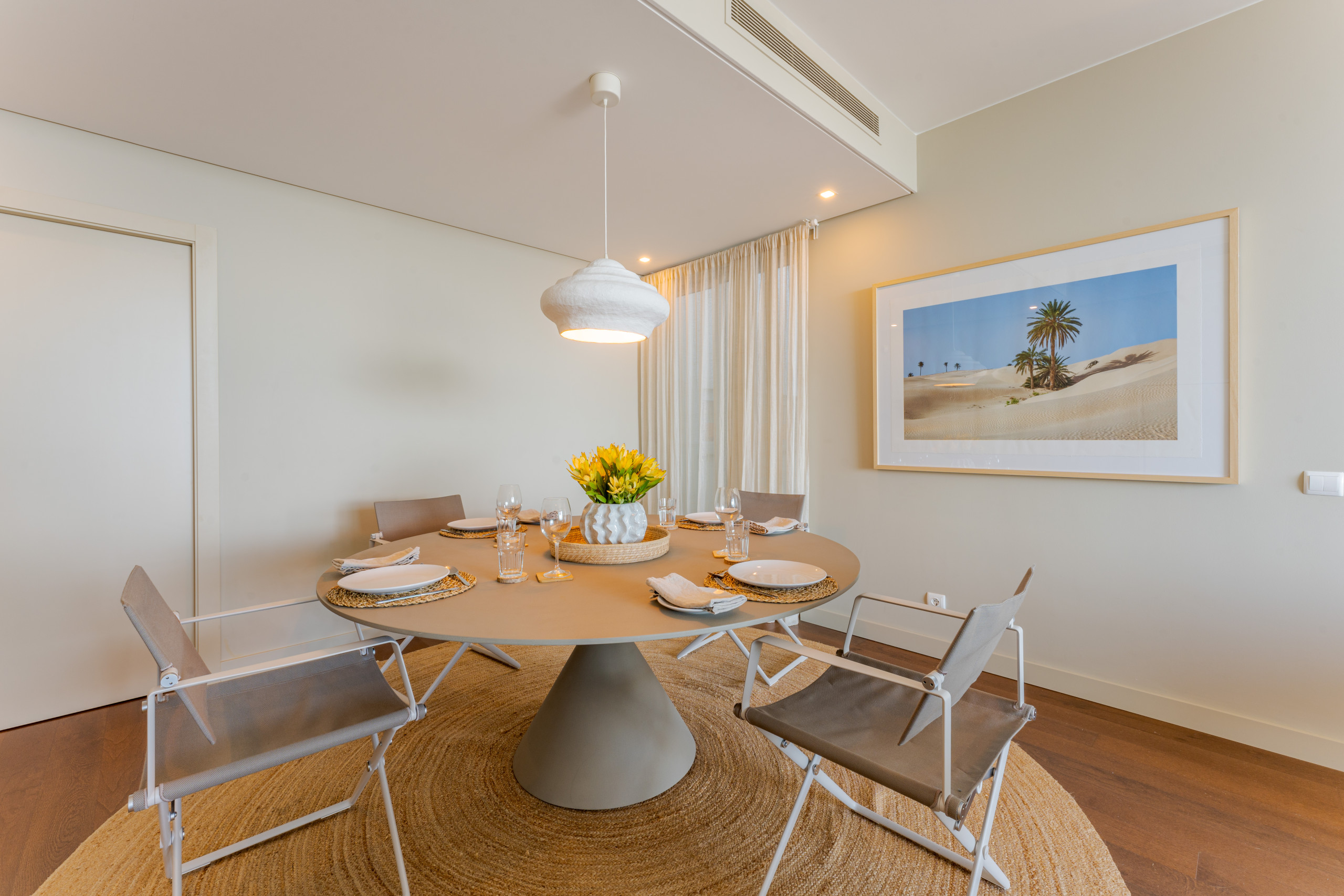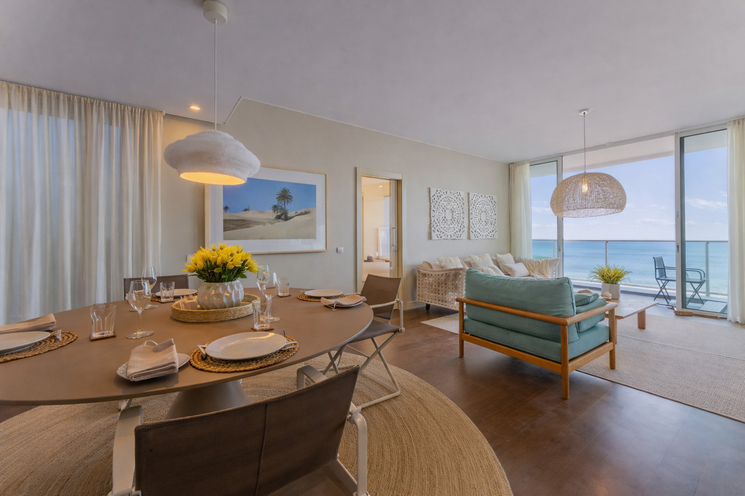 A nossa sala de estar e de jantar de conceito aberto é uma mistura harmoniosa de estilo e função, um espaço convidativo para reunir e jantar. A configuração da sala de jantar, centrada em torno de uma mesa circular elegante, é banhada pela luz natural que entra pela varanda adjacente, realçando o calor dos pisos de madeira. As cadeiras modernas e elegantes convidam os hóspedes a sentar-se e a desfrutar de uma refeição ou a conversar, enquanto são envolvidos pela paleta de cores serenas do apartamento, que reflecte o ambiente costeiro. Esta área de jantar é um testemunho da beleza do design minimalista, proporcionando um cenário elegante para refeições memoráveis e conversas envolventes.