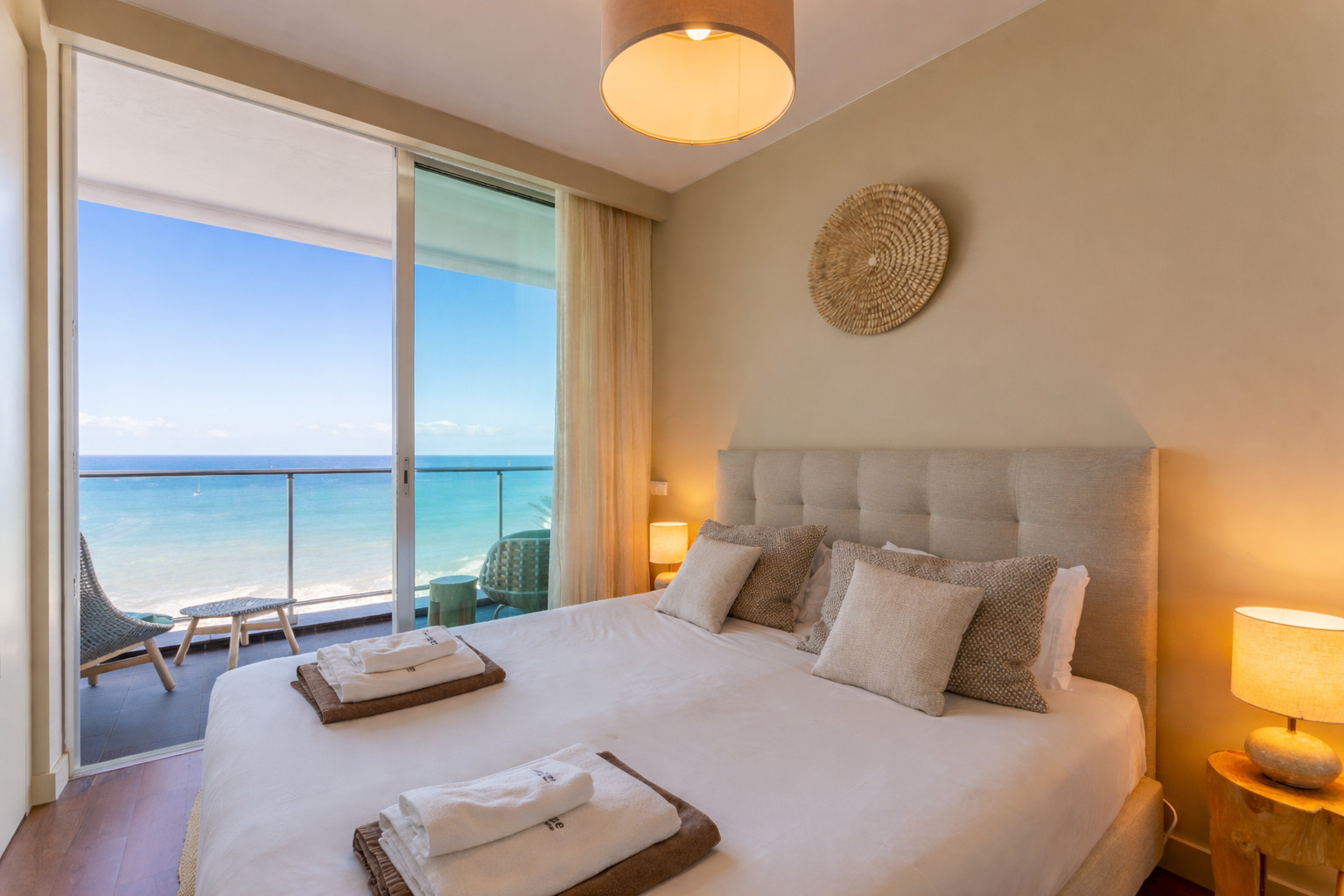 A nossa ampla varanda é o seu retiro privado ao ar livre, com assentos elegantes e vistas desobstruídas do Atlântico, oferecendo um local perfeito para cafés matinais ou brindes ao pôr do sol. Com uma configuração de mesa minimalista preparada para conversas íntimas, os sons tranquilos do mar proporcionam o acompanhamento perfeito para cada momento.