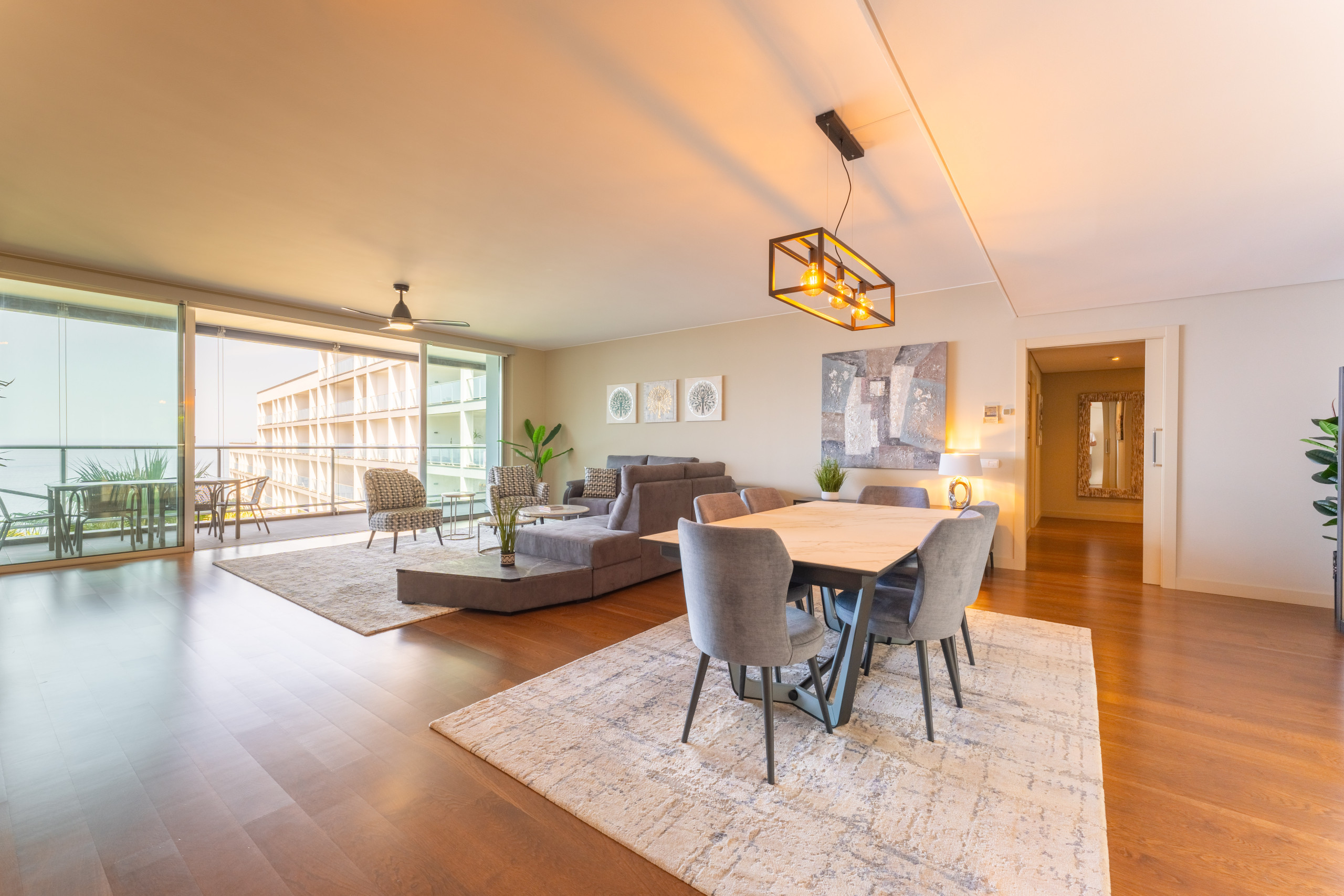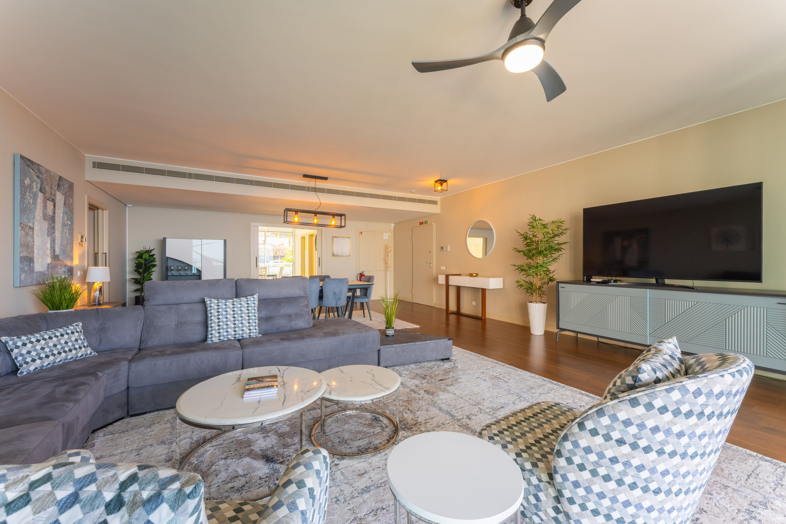 O condomínio tem 220 m² e a propriedade é toda num único piso. Tem 3 quartos, com capacidade para 6 pessoas.