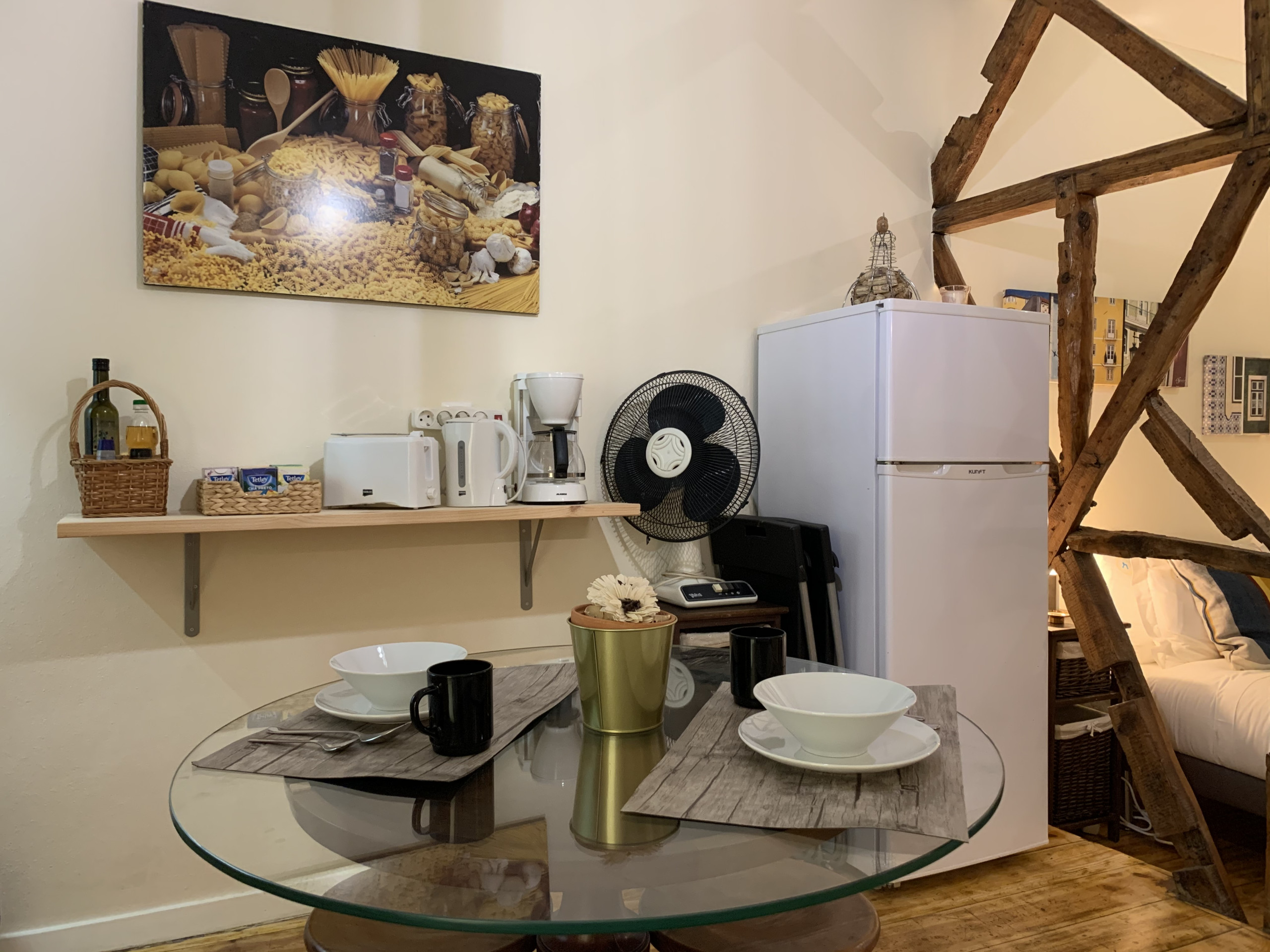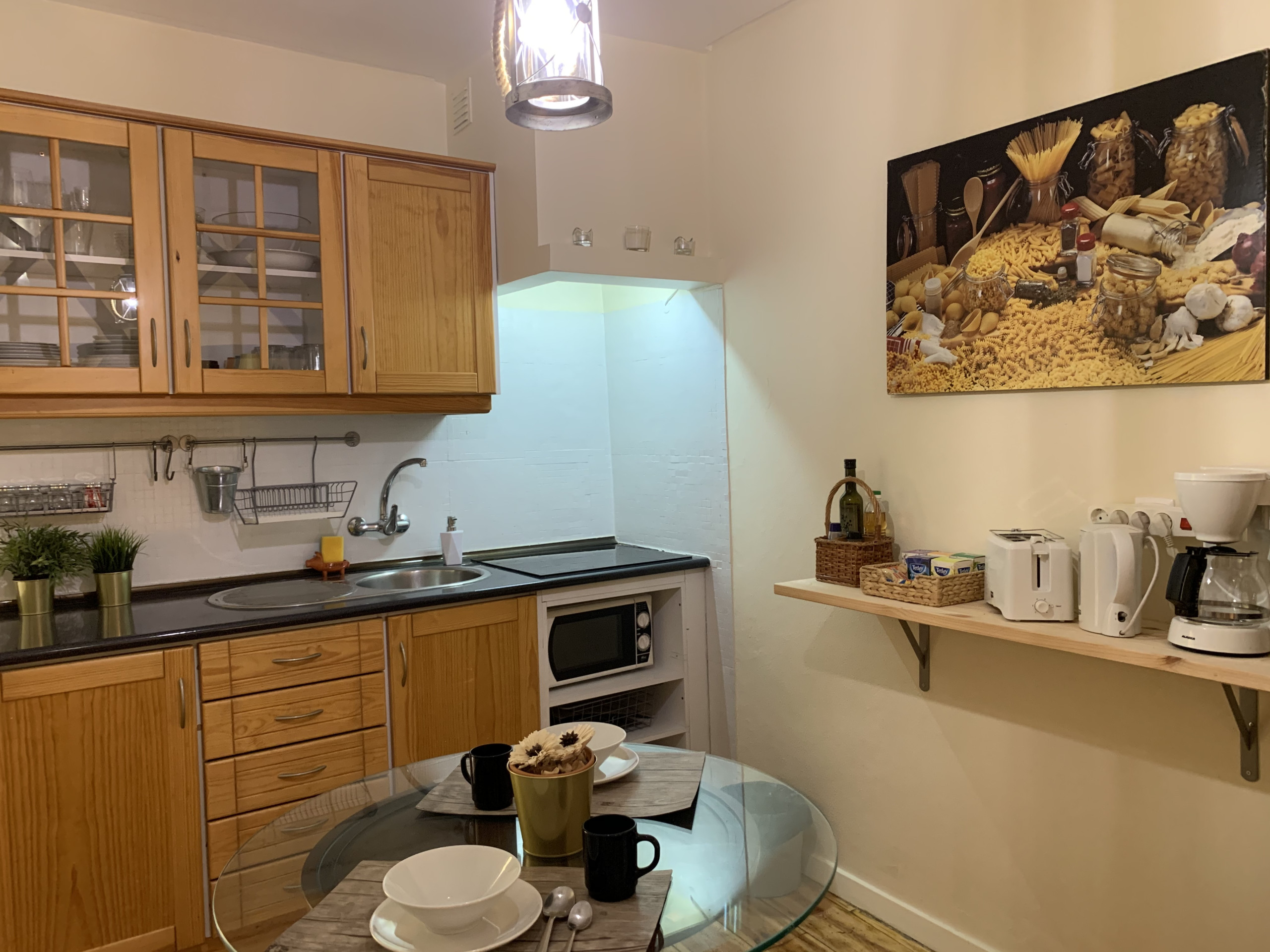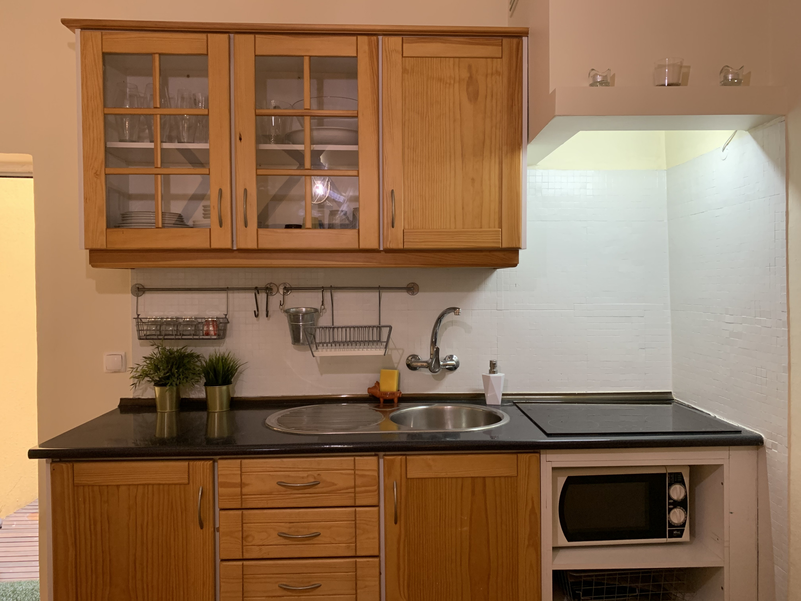 A cozinha, está equipada com frigorífico, microondas, congelador, louça/talheres, torradeira e jarro eléctrico.