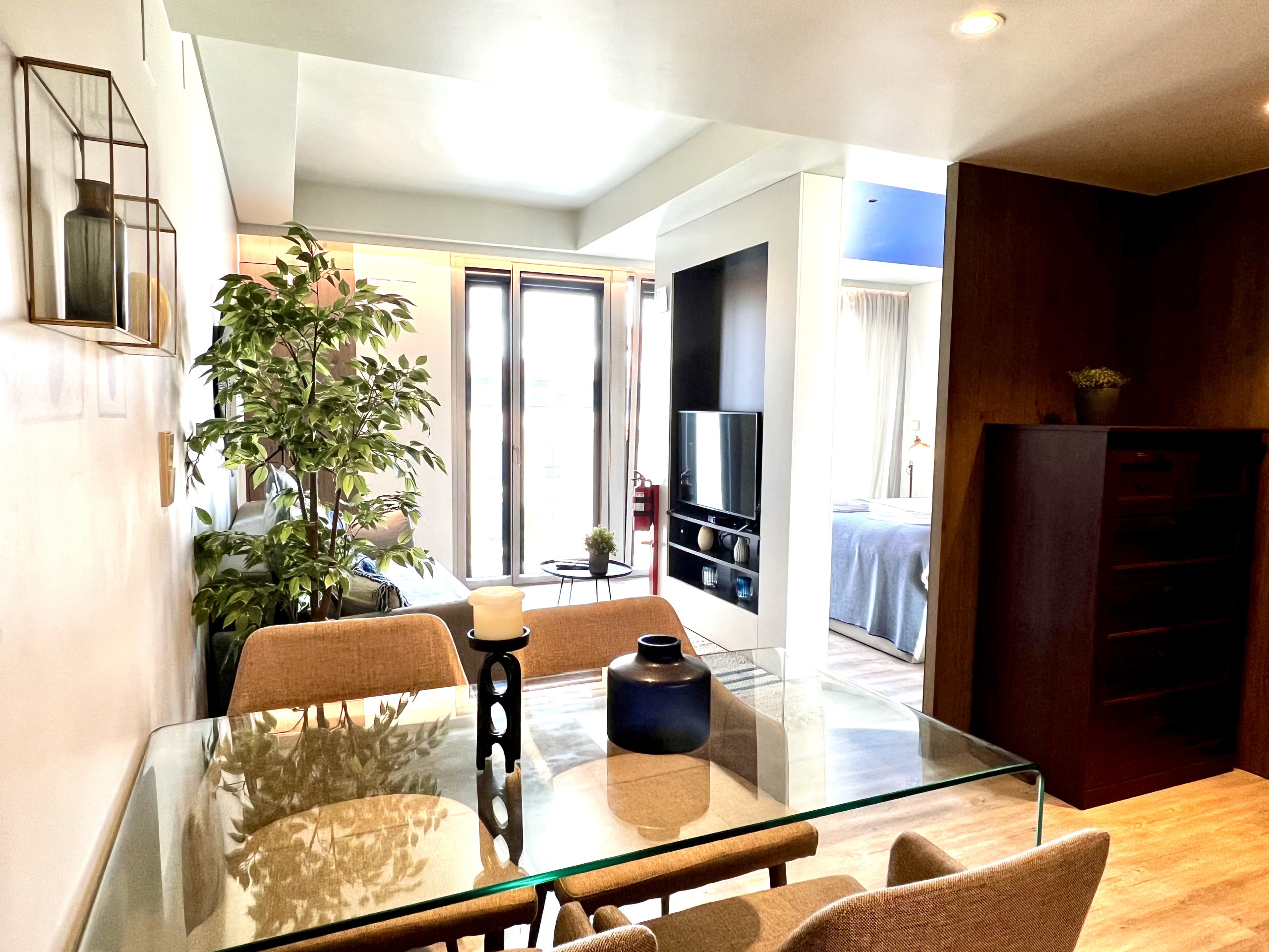 O apartamento é um open space com kitchenette totalmente equipada com frigorífico com congelador, máquina de lavar louça, placa vitrocerâmica, micro-ondas, máquina de café, torradeira, chaleira eléctrica. Junto à cozinha tem uma mesa de refeições para quatro pessoas.
