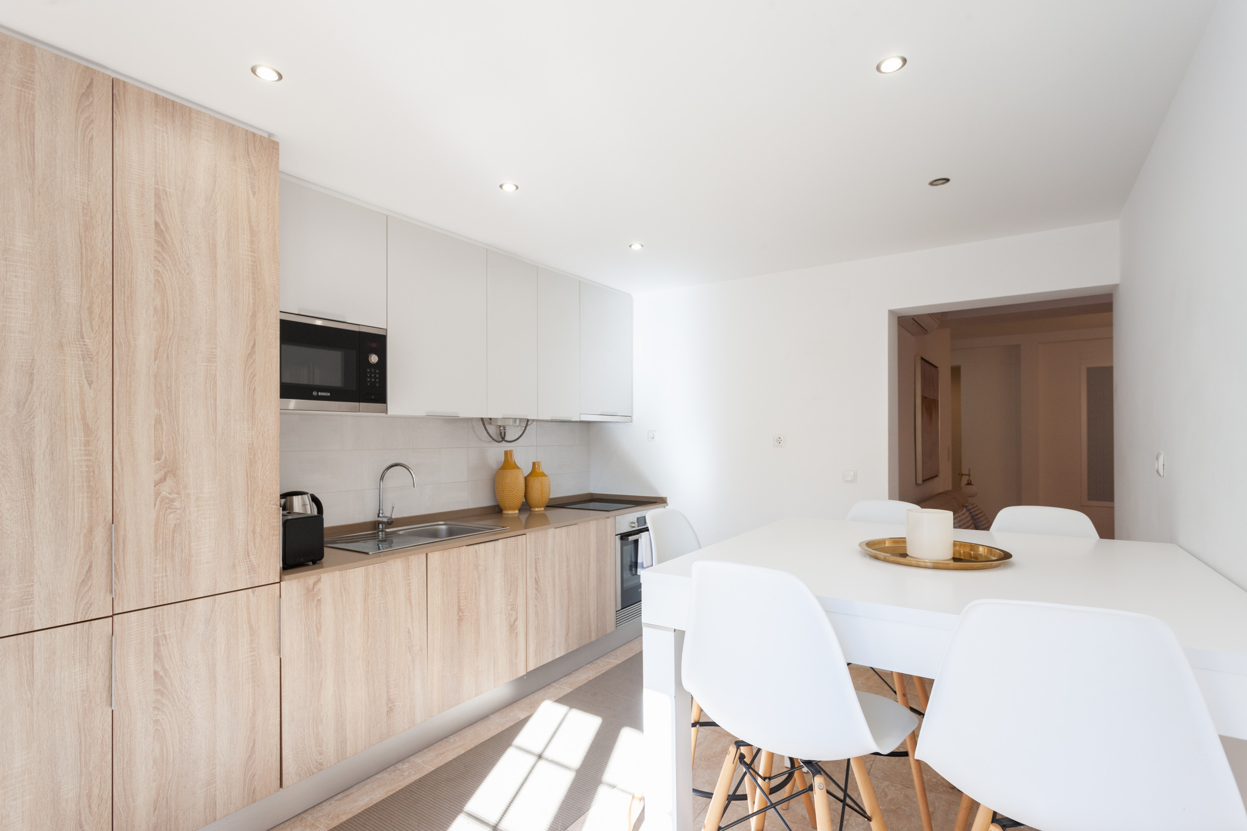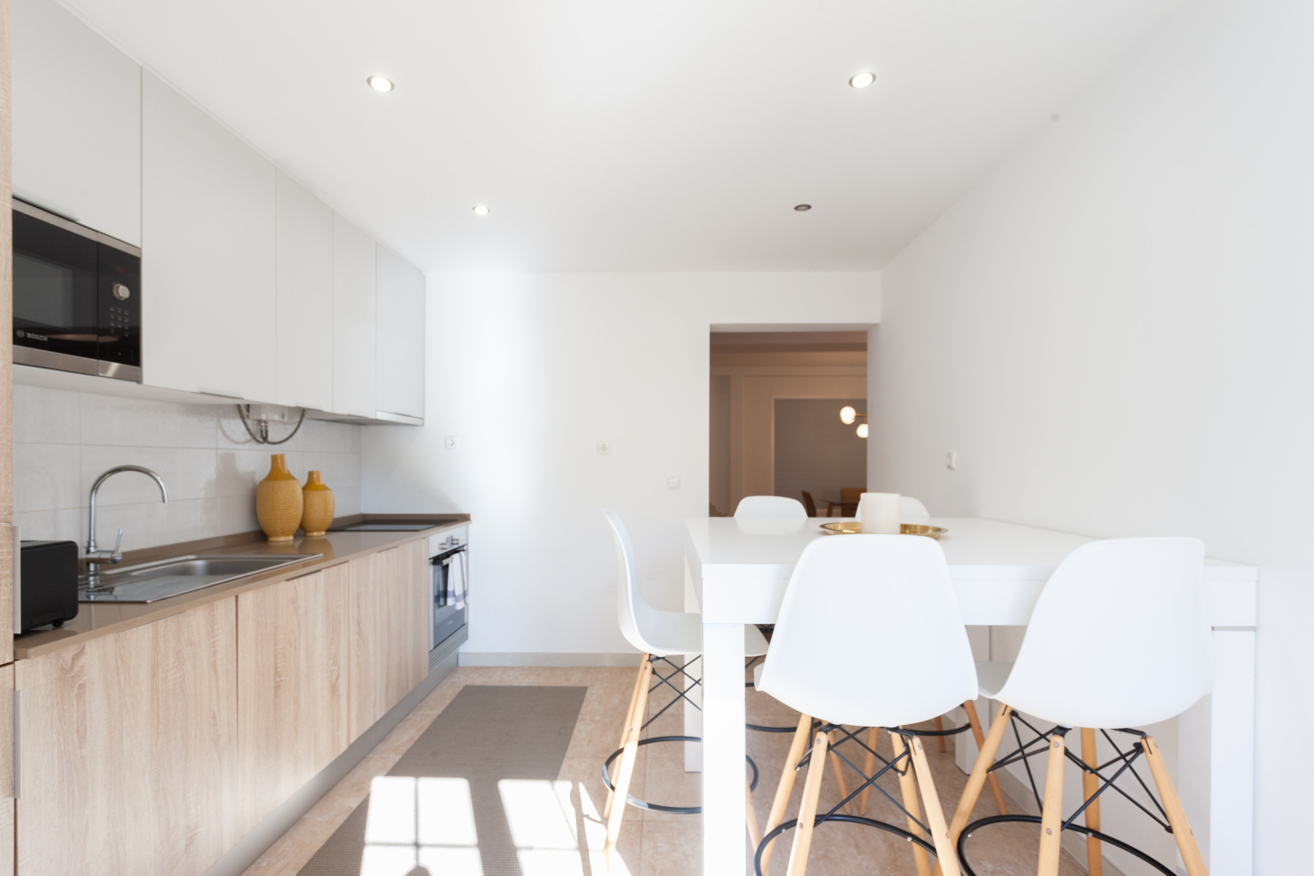 Este fantástico apartamento possui dois quartos com cama de casal e um quarto com beliche, um banheiro, uma cozinha totalmente equipada e uma luminosa sala de estar com área de jantar e varanda.
