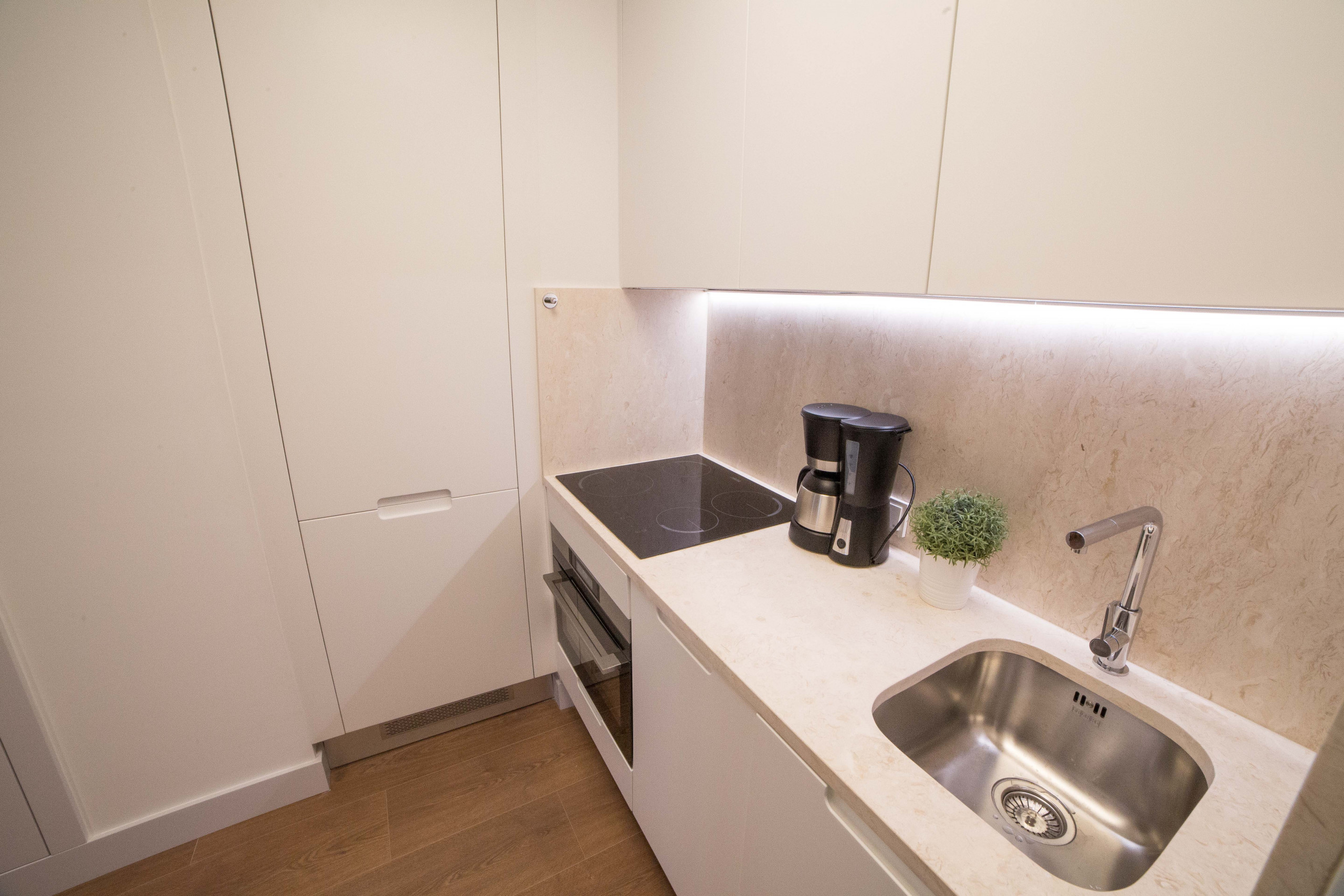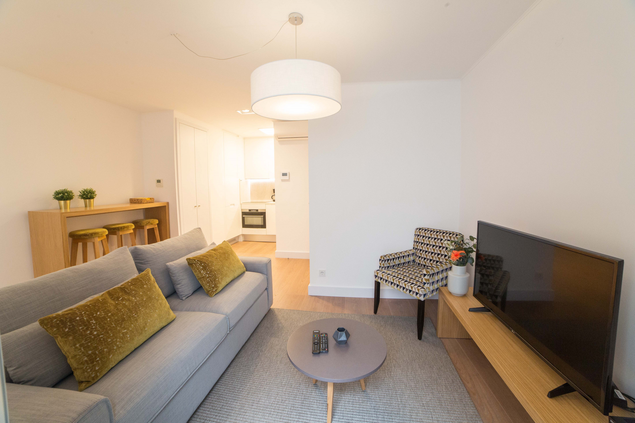 Este apartamento moderno tem um quarto com uma confortável cama de casal, uma casa de banho com chuveiro, uma cozinha totalmente equipada e uma sala de estar com TV e sofá-cama para um hóspede.
