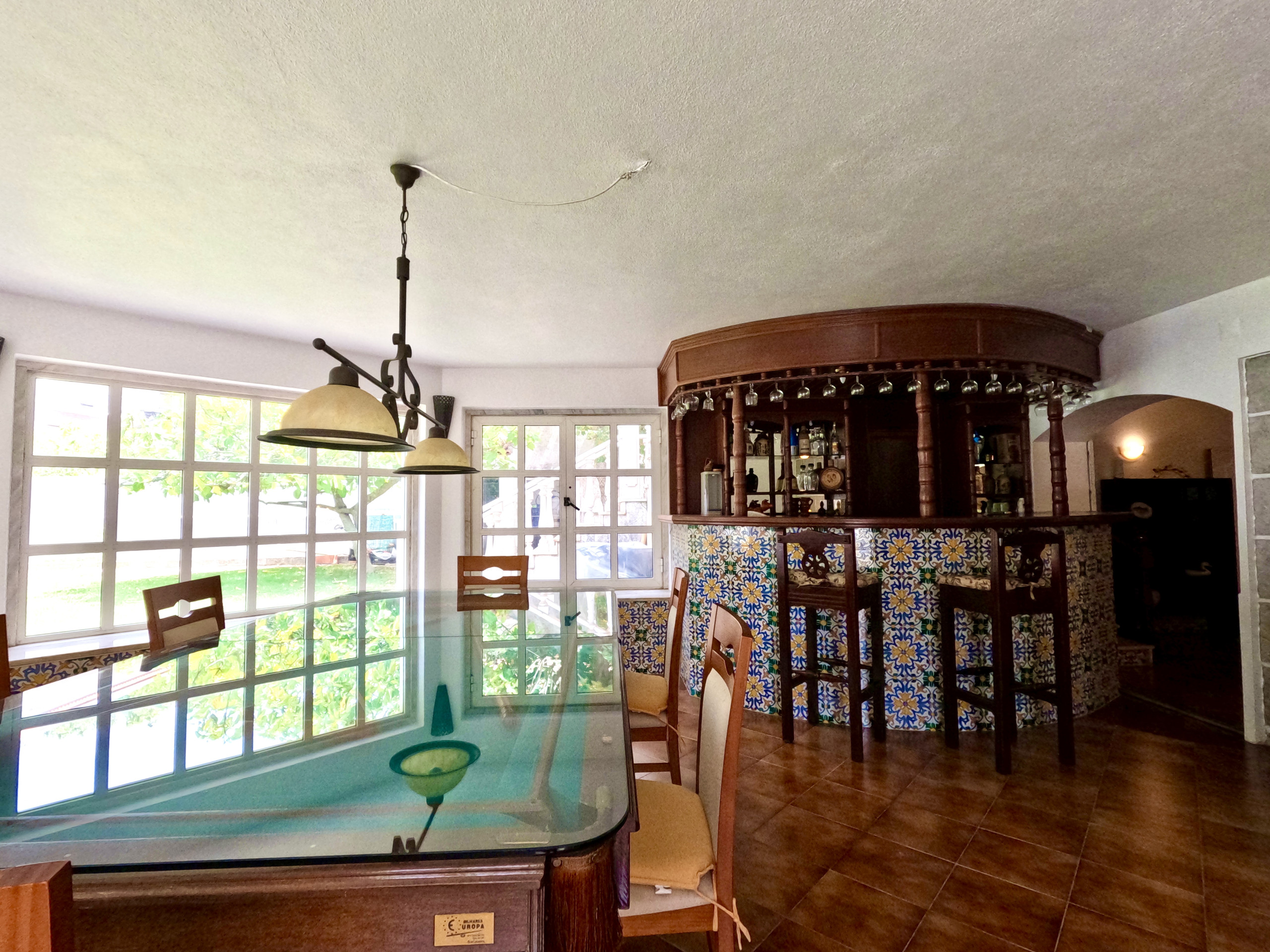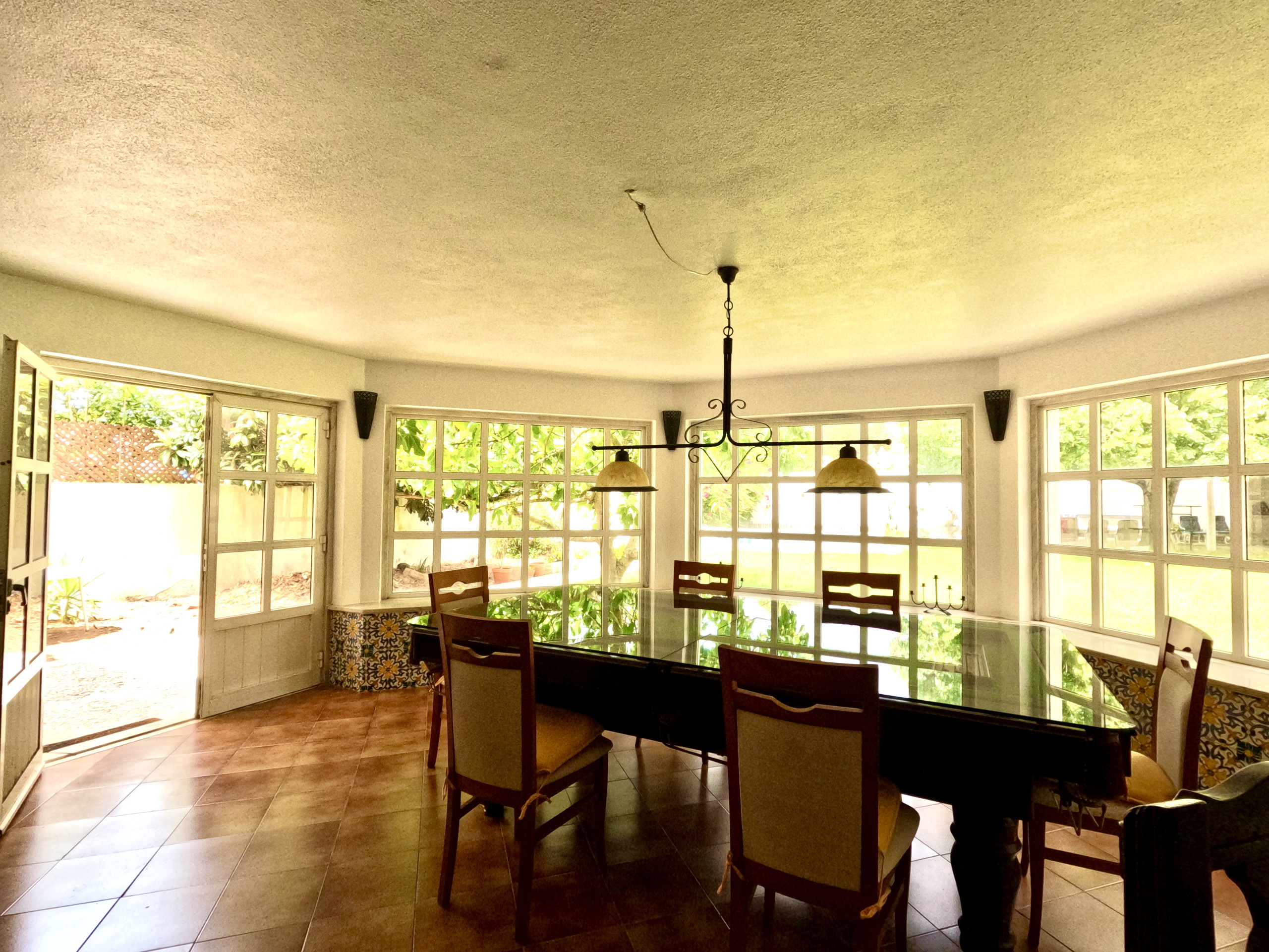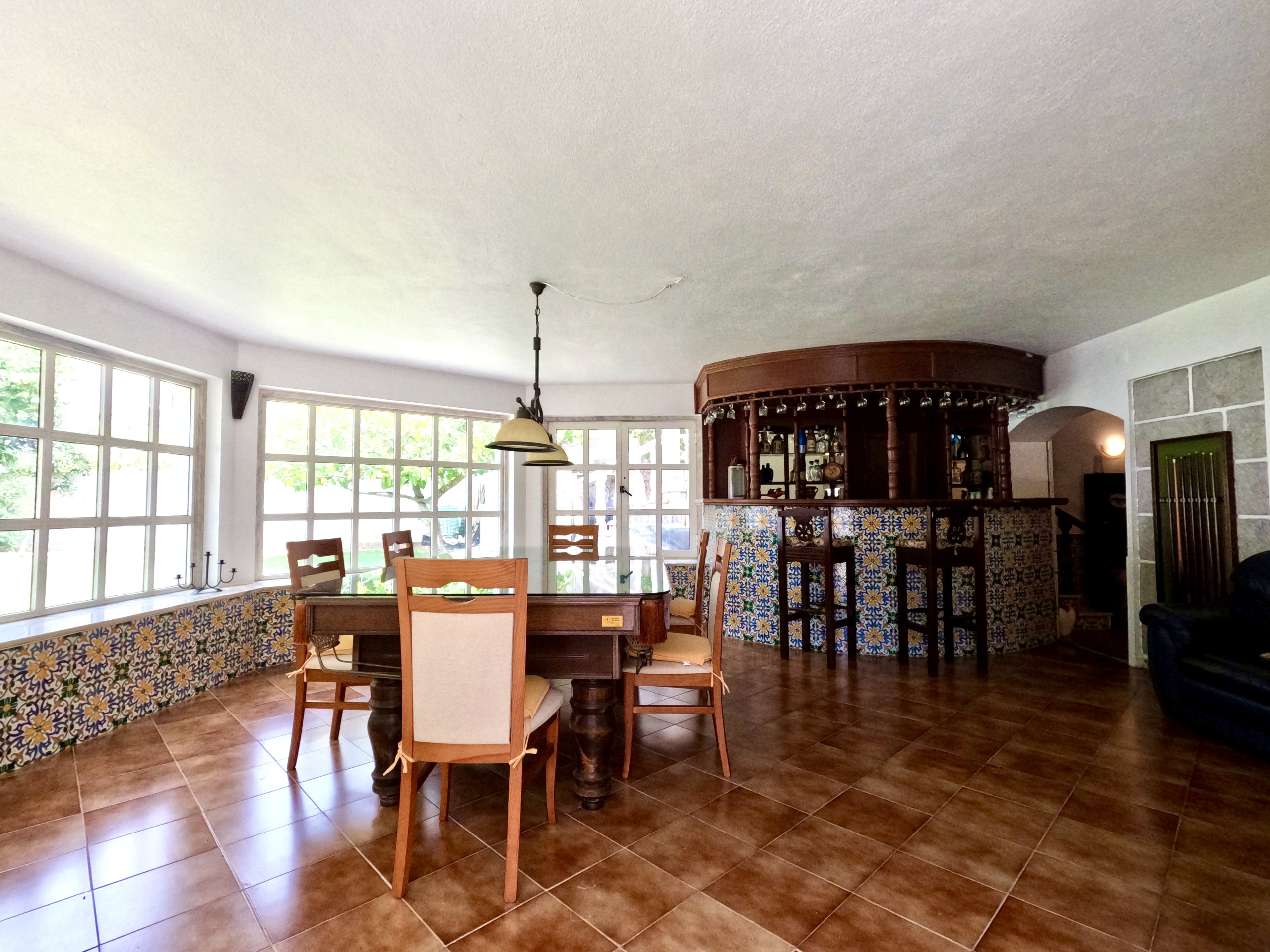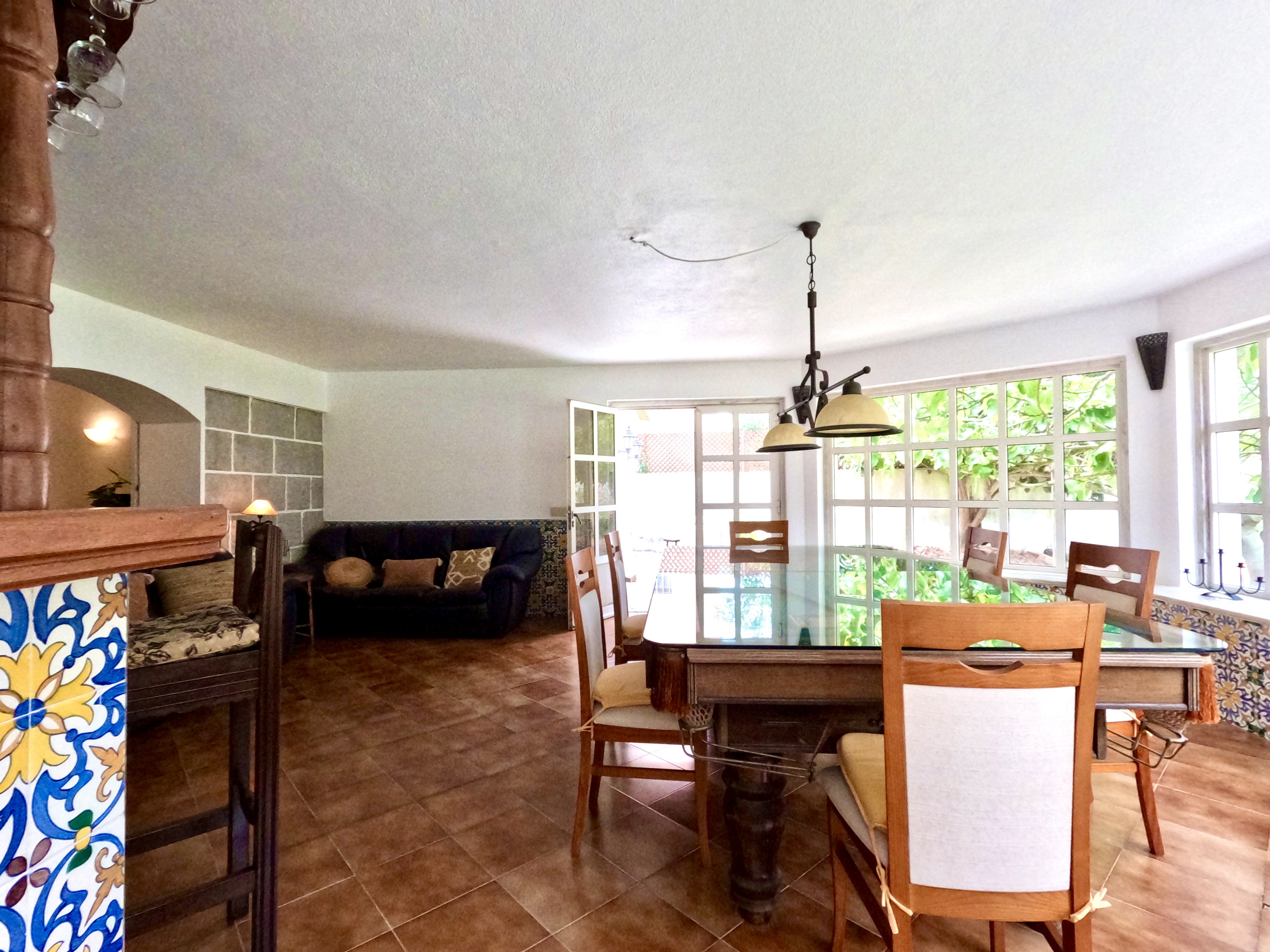 A sala de estar é muito confortável e tem uma TV e ligação internet WI-FI em toda a casa. A sala de jantar é ampla e está virada para o jardim. Tem uma mesa de refeições para 6 pessoas e uma zona de bar.