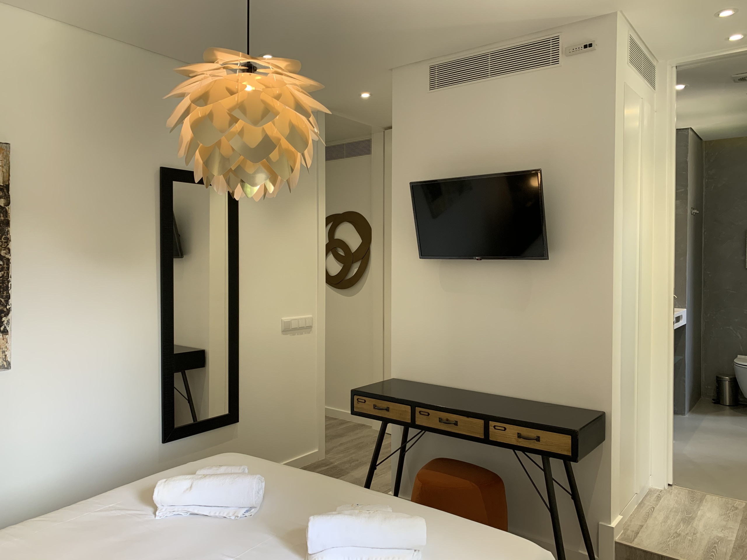 The two bedrooms have double beds, wardrobes, TV so that each guest can individually enjoy their TV. One of the bedrooms is a suite and the other has a bathroom next to the bedroom door.