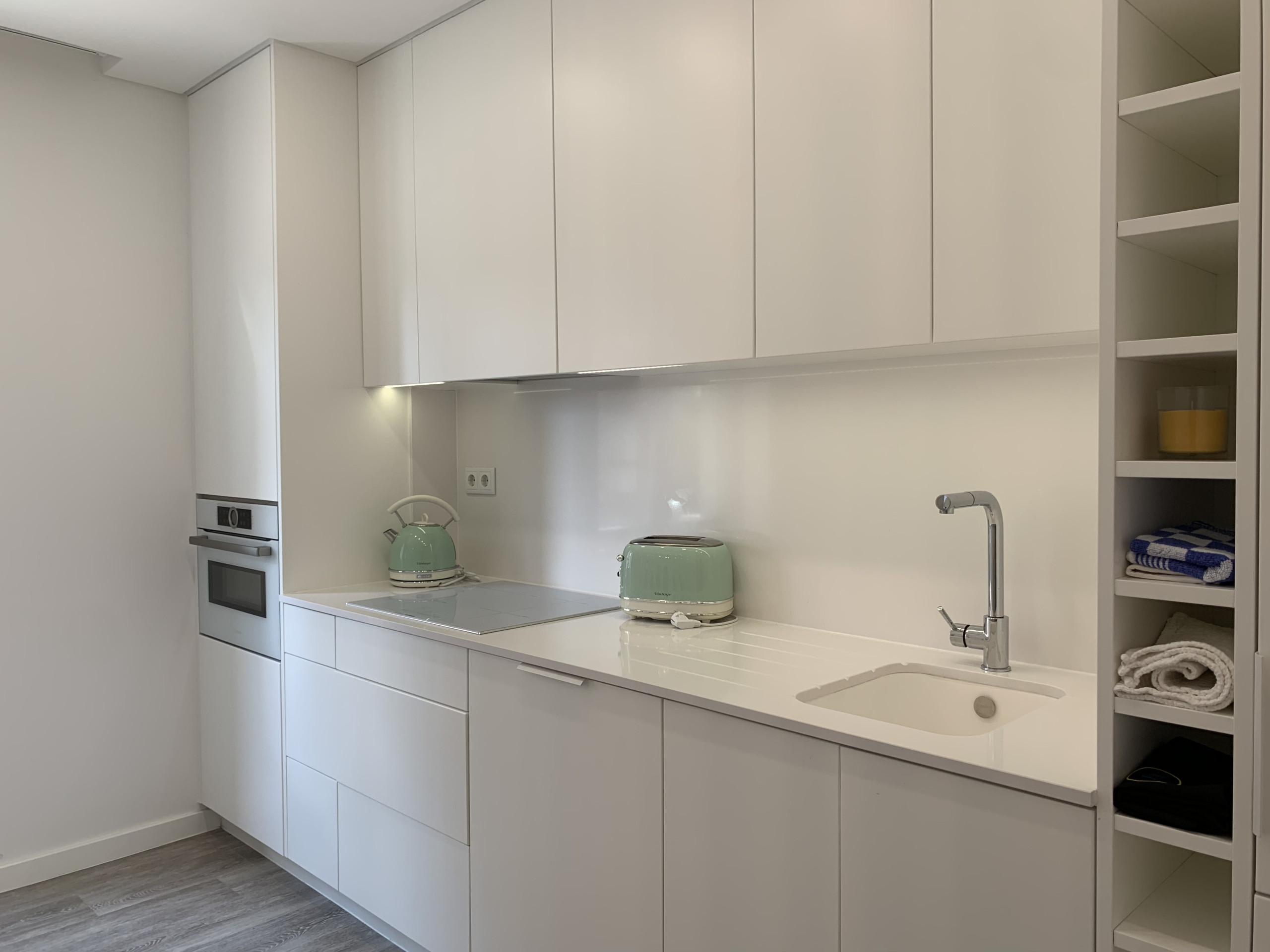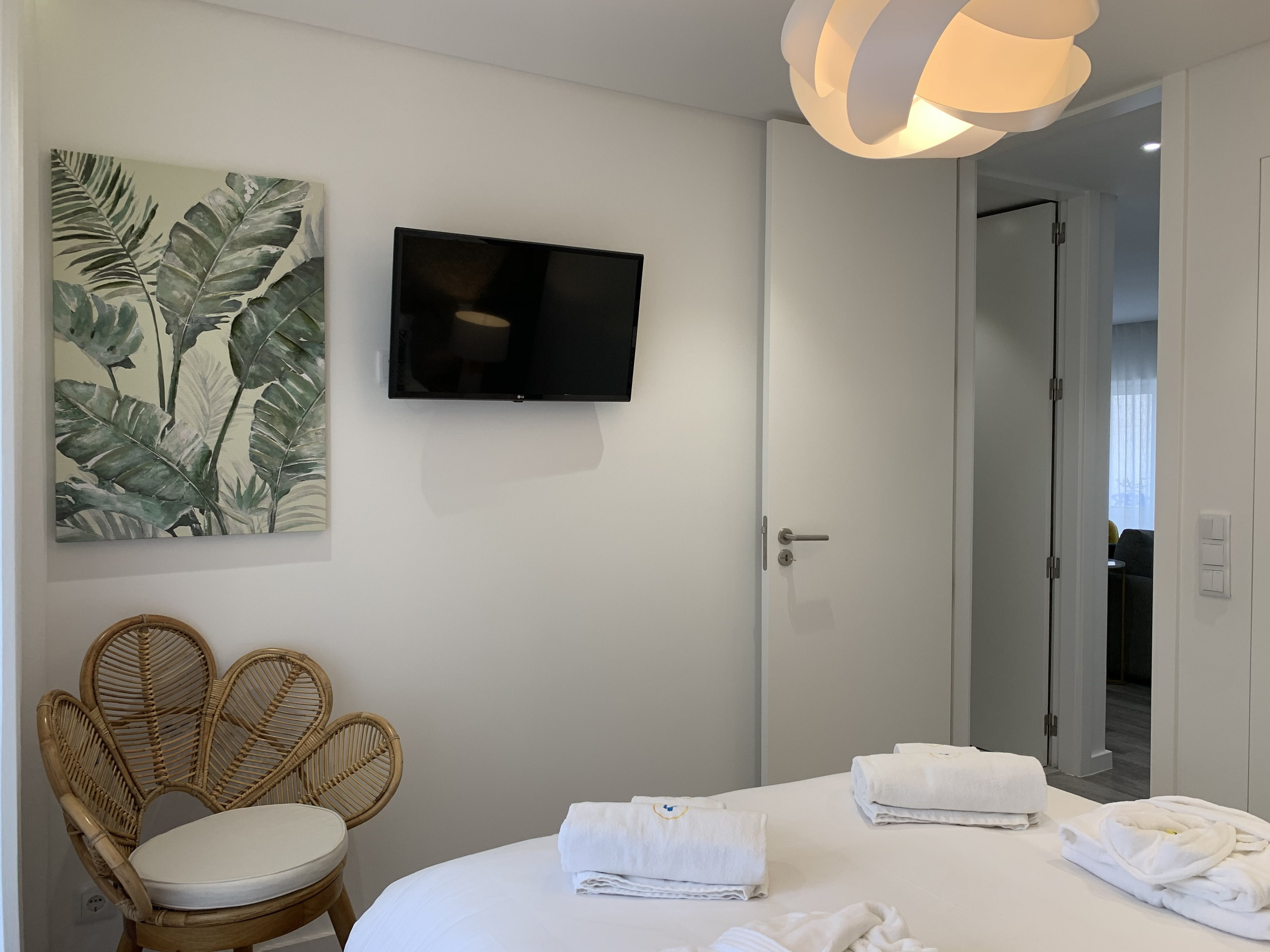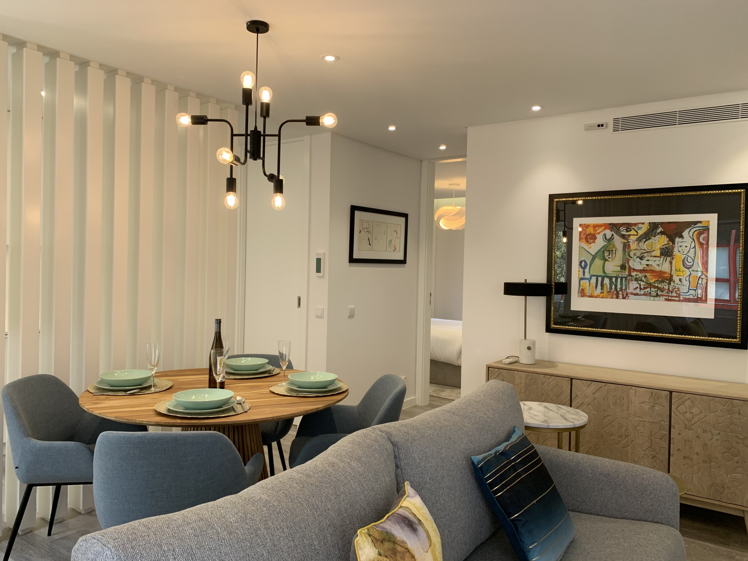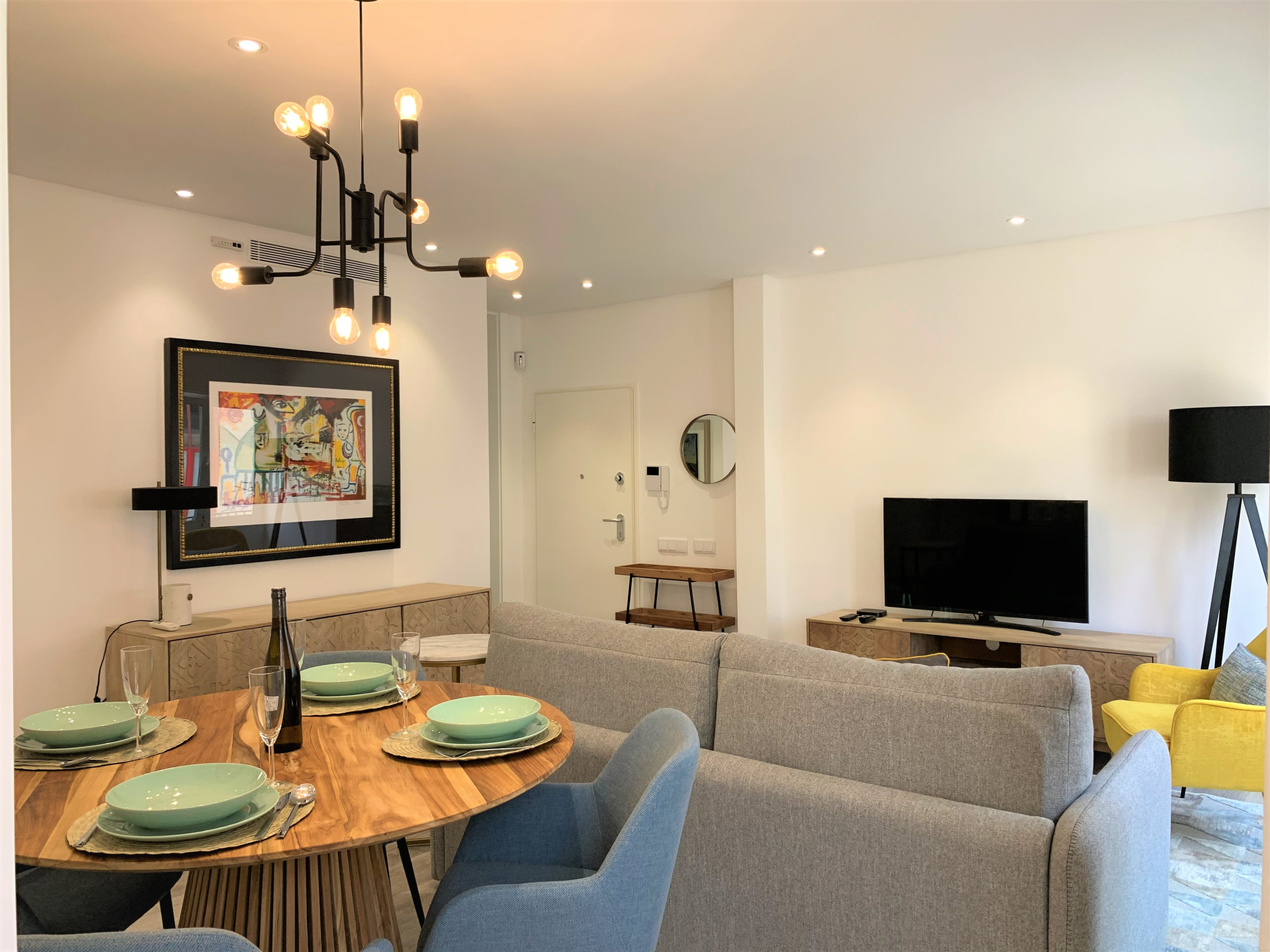 The two bedrooms have double beds, wardrobes, TV so that each guest can individually enjoy their TV. One of the bedrooms is a suite and the other has a bathroom next to the bedroom door. The living room has a TV and WI-FI throughout the apartment. It also includes a dining area with a table for six people and a fully equipped kitchenette with everything you need to prepare your homemade meals.