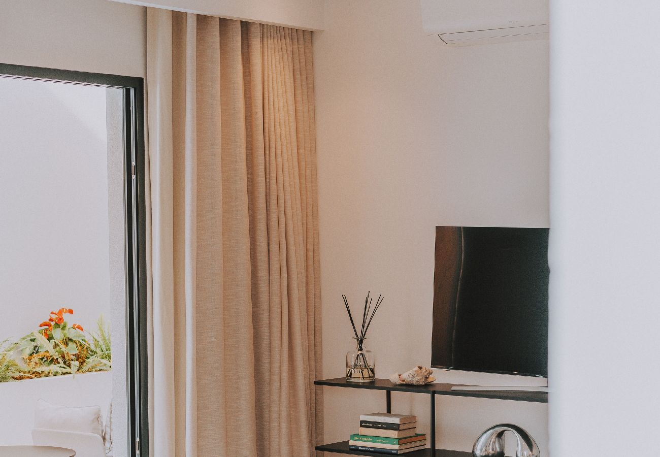 Apartment 102 has one bedroom with a queen-size bed, a full three-piece bathroom, a fully equipped kitchen, ample closet space, living area with sofa and a small dining area. This apartment doesn’t have a view of the ocean, but what you lack in view you gain in a large outdoor green terrace with sitting area, perfect for reading a good book or relaxing after a long day of touring the island.