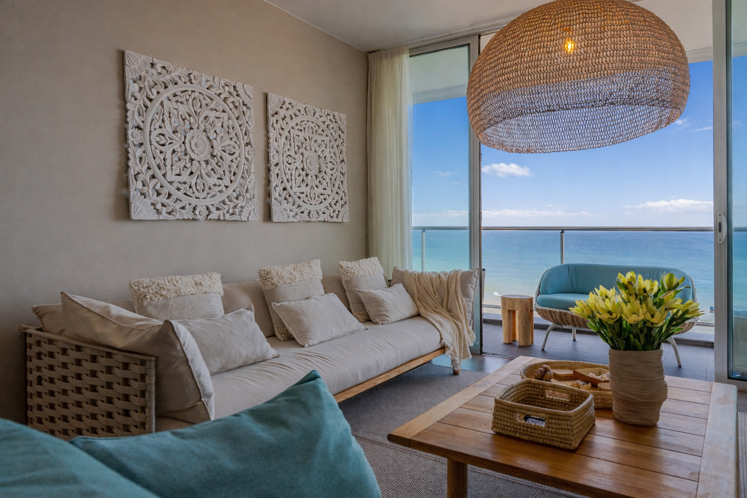 Discover tranquility in our sunlit living room, where comfort meets coastal elegance. Designed with relaxation in mind, the space features a plush cream sofa draped with a cozy throw, ready to envelop you as you unwind. Accented by a vibrant teal armchair, the room invites you to indulge in the art of leisure, surrounded by soft, neutral tones that echo the sandy shores just beyond the sheer curtains. A chic coffee table centers the room, adorned with select reads that invite quiet contemplation.