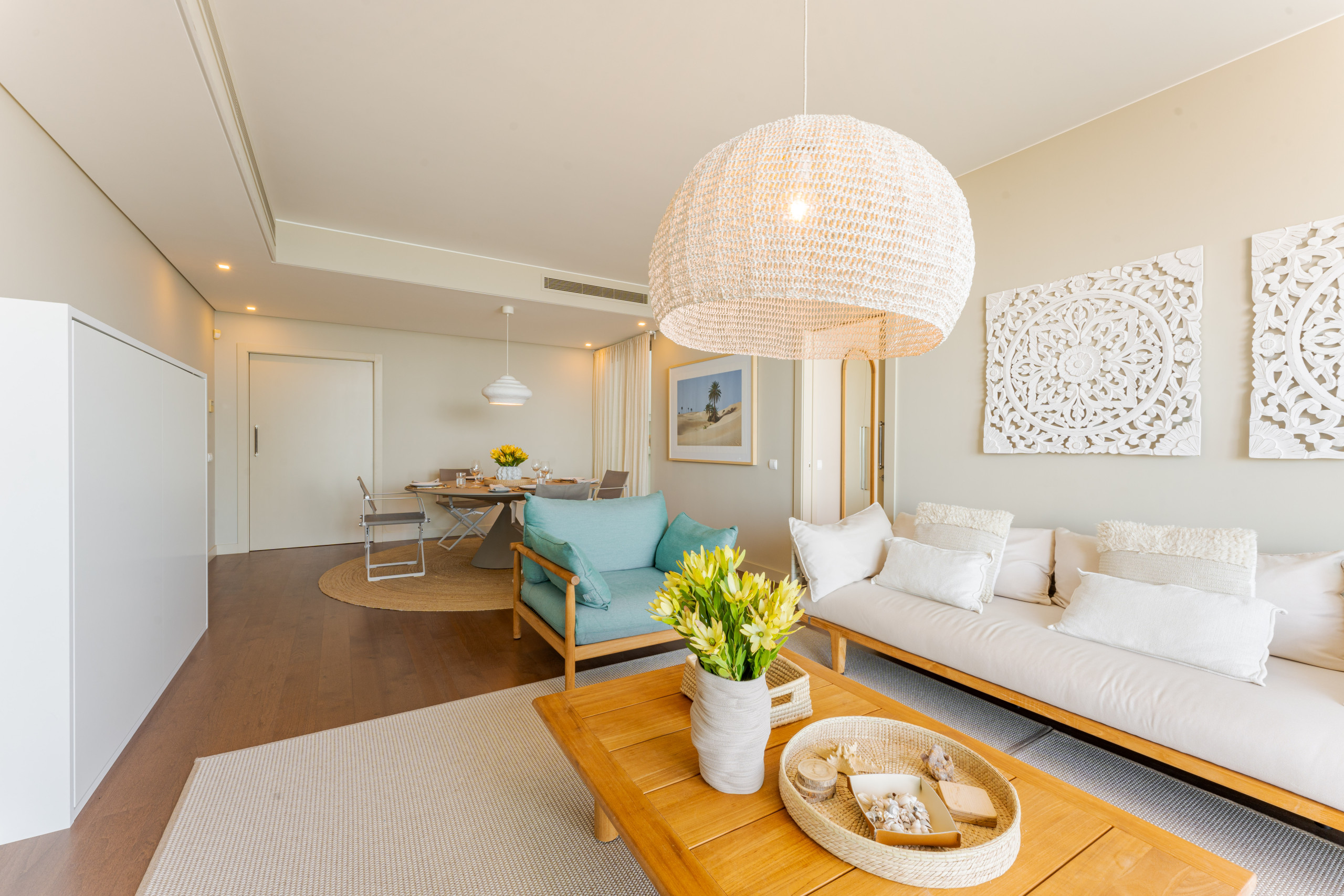 Our open-concept living and dining area is a harmonious blend of style and function, an inviting space to gather and dine. The dining setup, centered around a chic circular table, is bathed in natural light that pours in from the adjacent balcony, enhancing the warmth of the wooden floors. Modern, sleek chairs beckon guests to sit and enjoy a meal or engage in conversation, all while being enveloped by the apartment's serene color palette that mirrors the coastal setting. This dining area is a testament to the beauty of minimalist design, providing an elegant backdrop for memorable meals and engaging chats.