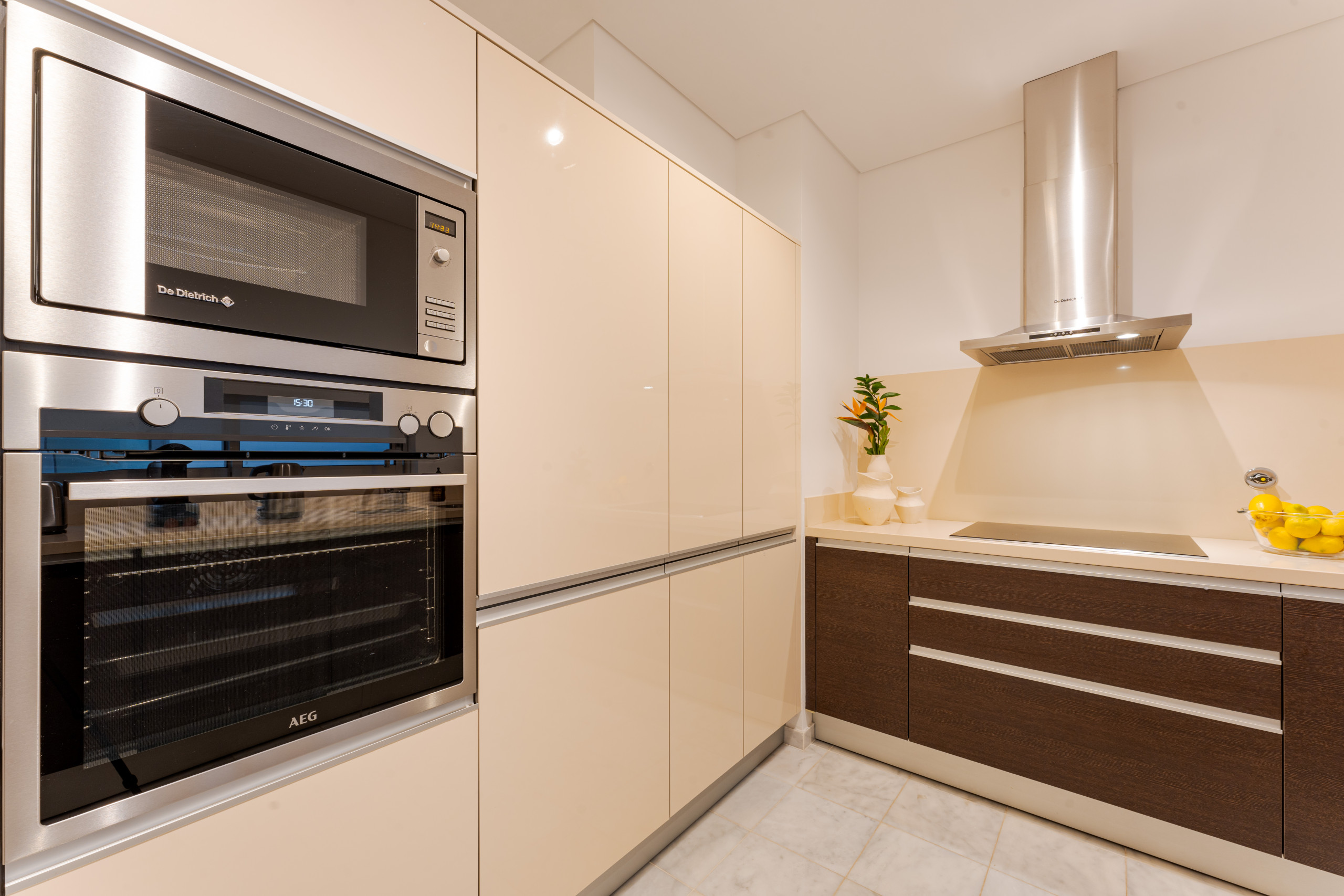 Whip up culinary delights in our state-of-the-art kitchen, where functionality meets sleek design. Featuring custom quartz countertops and sophisticated German appliances, the space is a home chef's dream. An eye-level oven, grill, and microwave stand ready for your gourmet creations, while the hob promises precise temperature control for every dish. Equipped with a coffee machine for your morning brew, a dishwasher for easy cleanup, and a combination washer/dryer for ultimate convenience, this kitchen blends practicality with the luxury of a modern home.