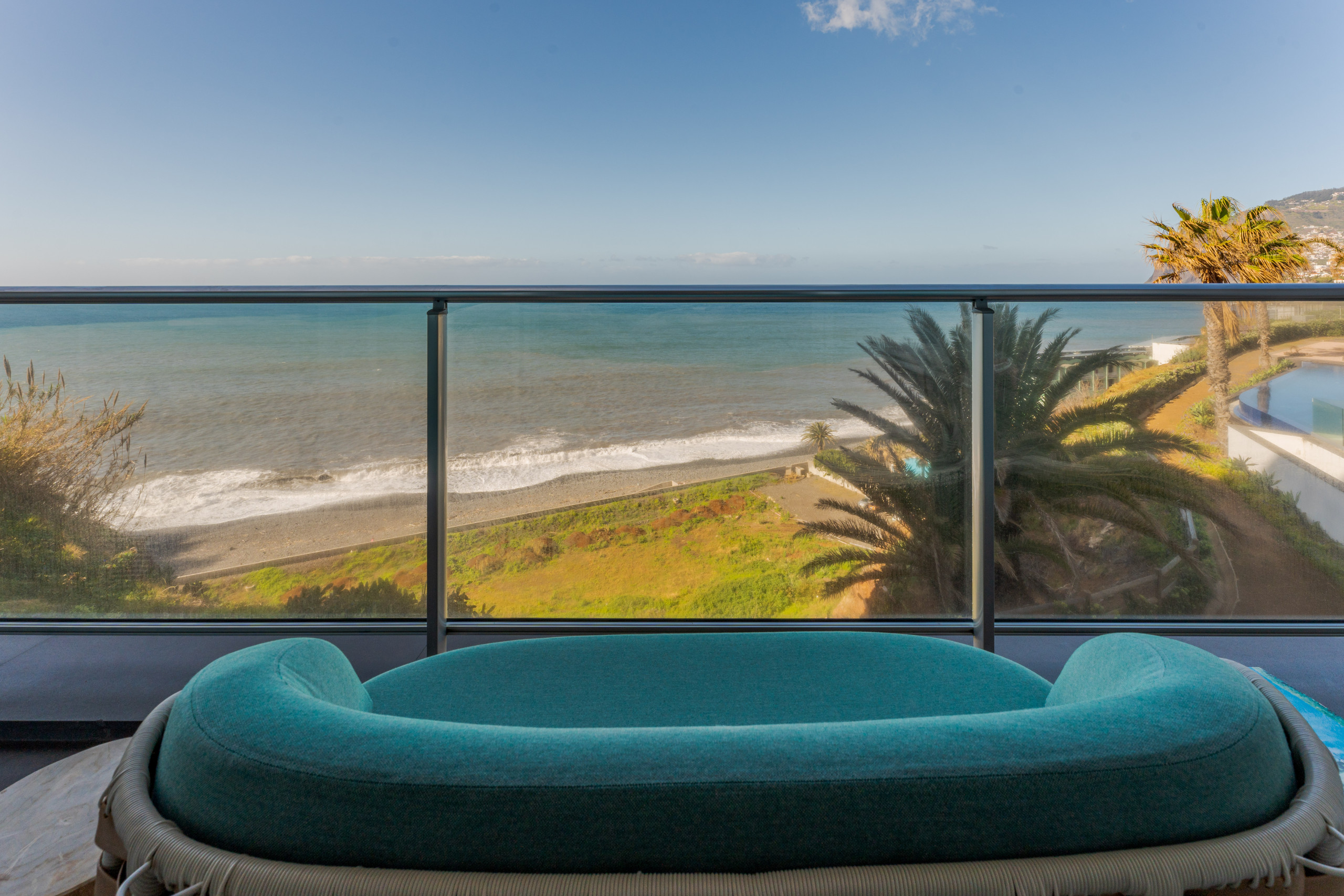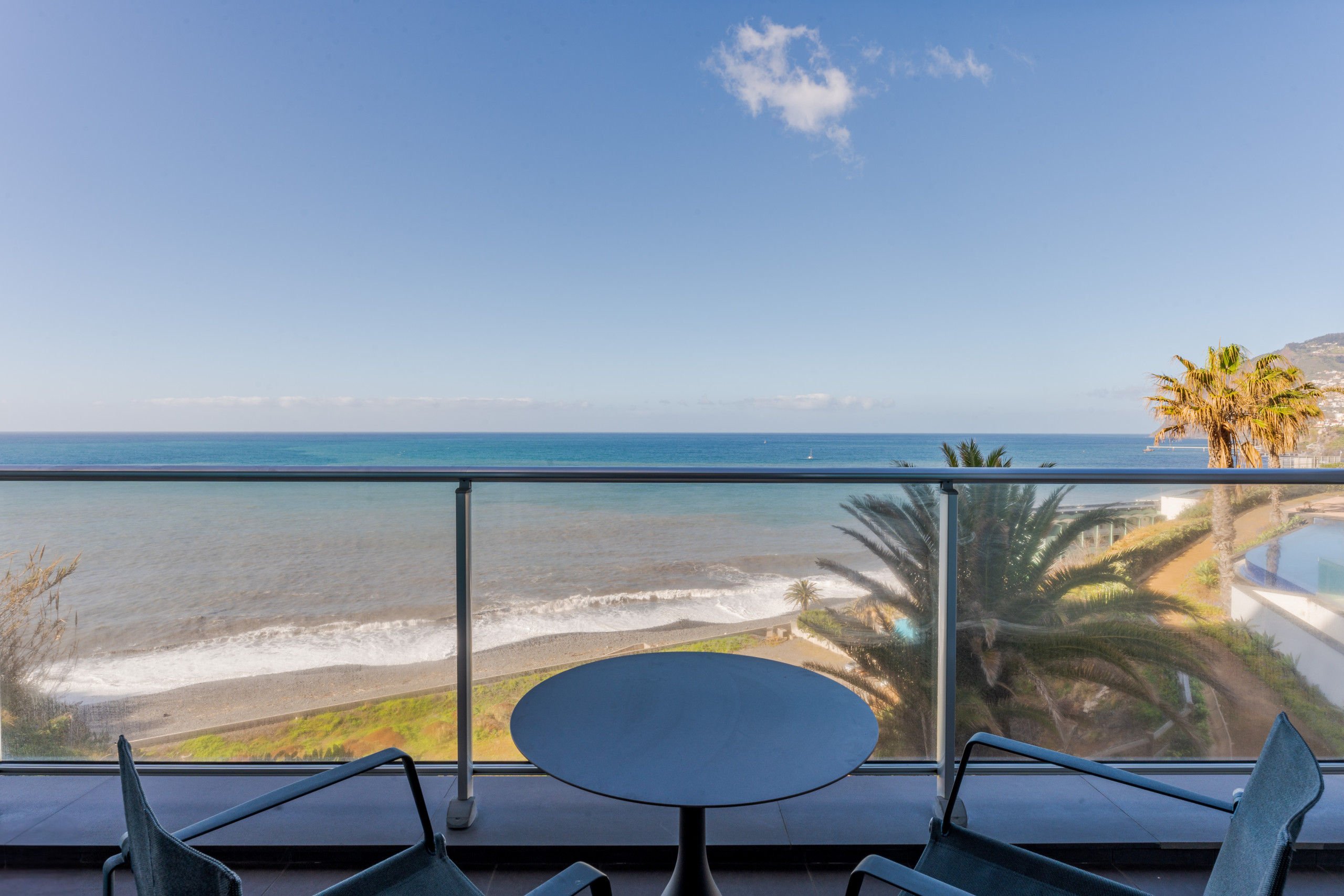 Our expansive balcony is your private outdoor retreat, featuring stylish seating and unobstructed views of the Atlantic, offering a perfect spot for morning coffees or sunset toasts. With a minimalistic table setting poised for intimate conversations, the tranquil sounds of the sea provide the perfect accompaniment to every moment.