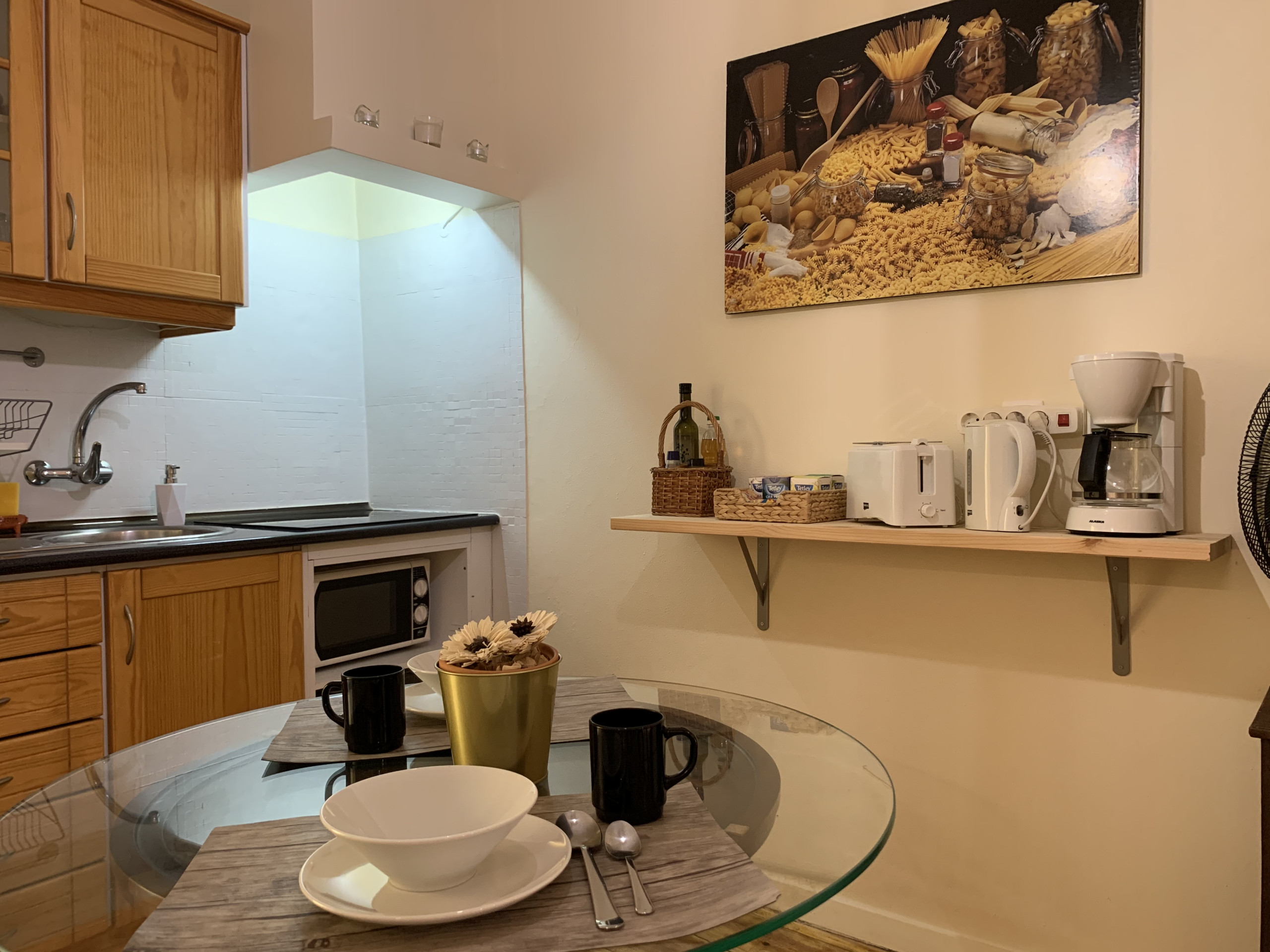 the kitchen, refrigerator, microwave, freezer, dishes/cutlery, toaster and kettle are provided.