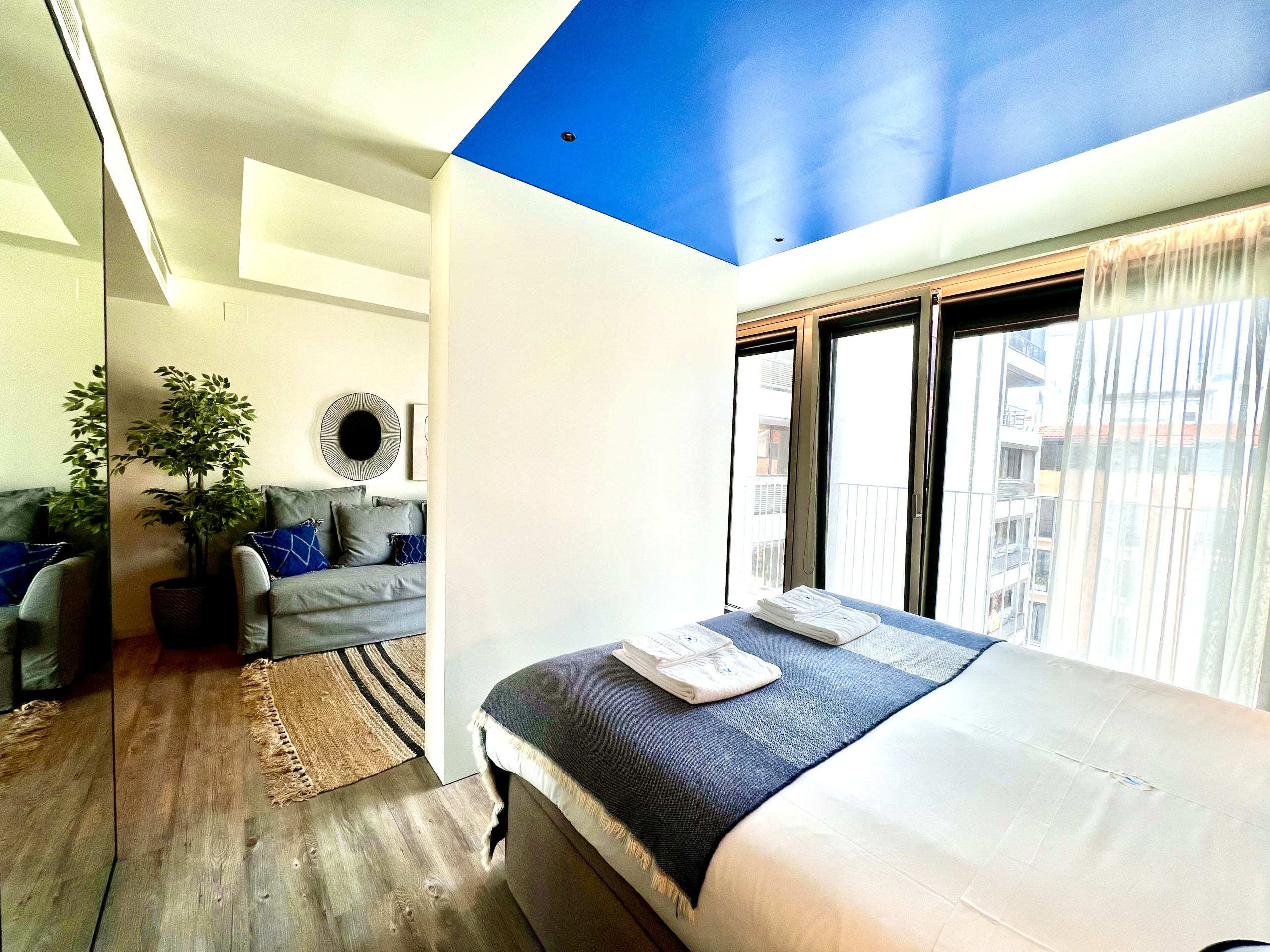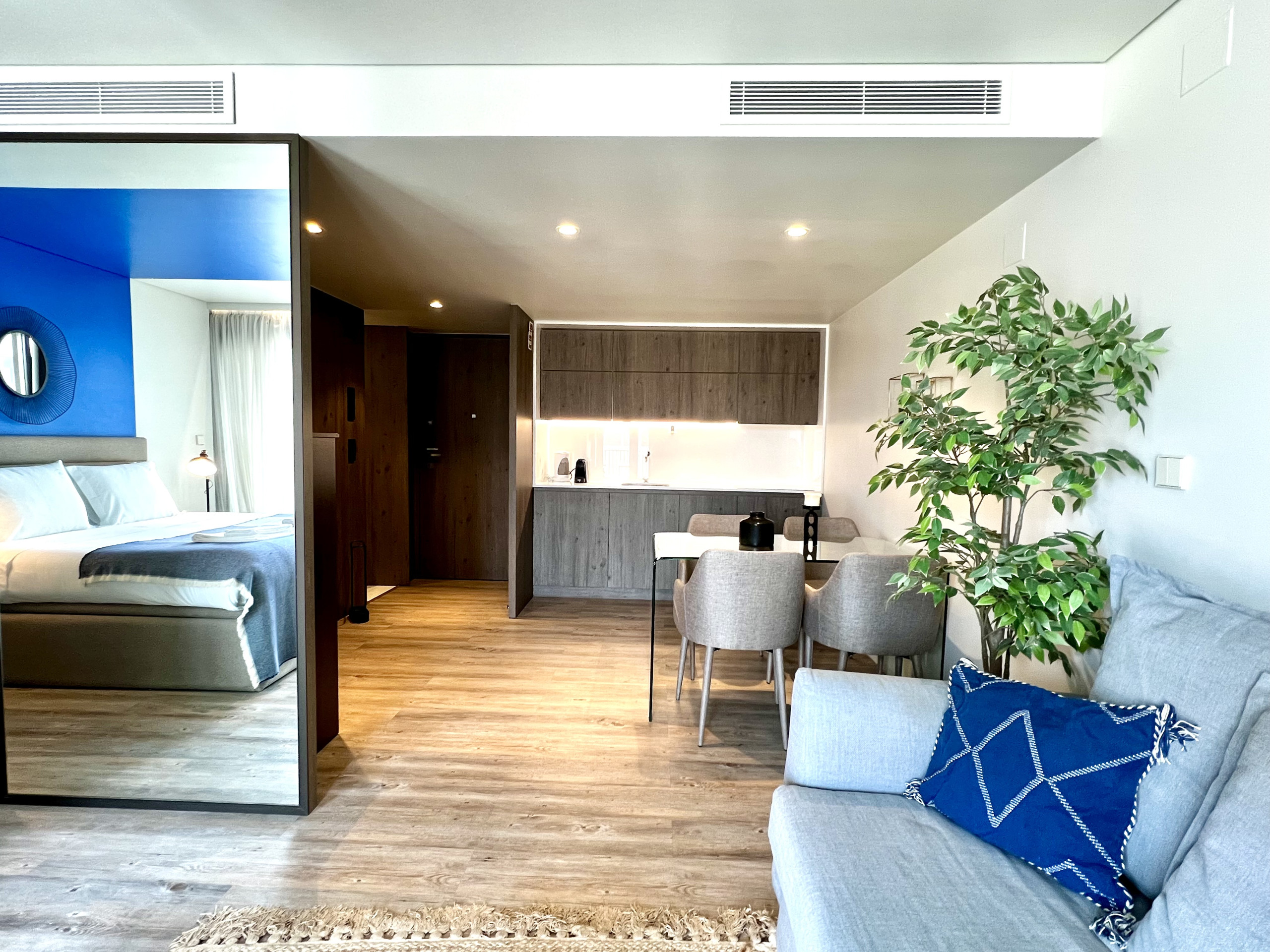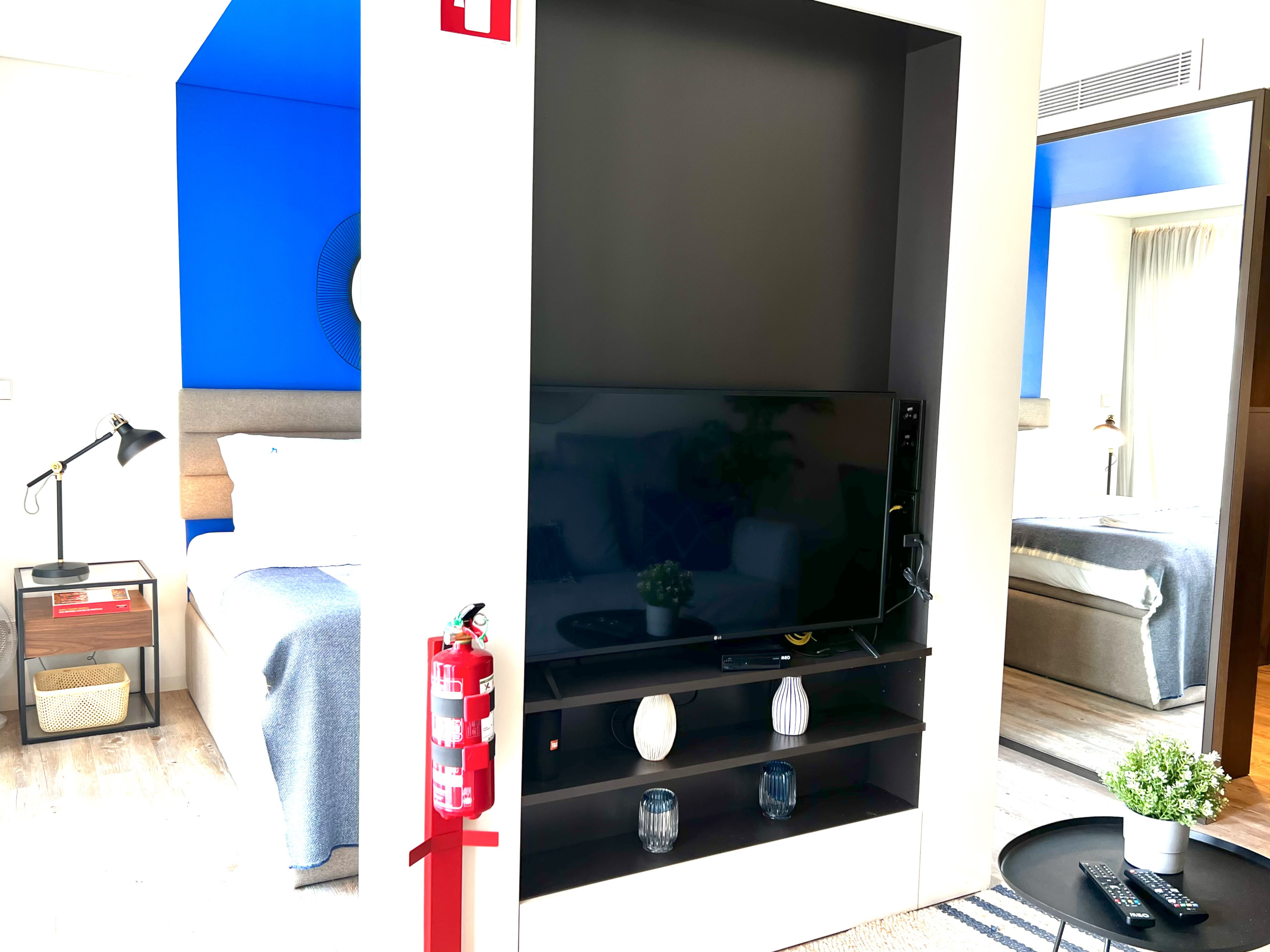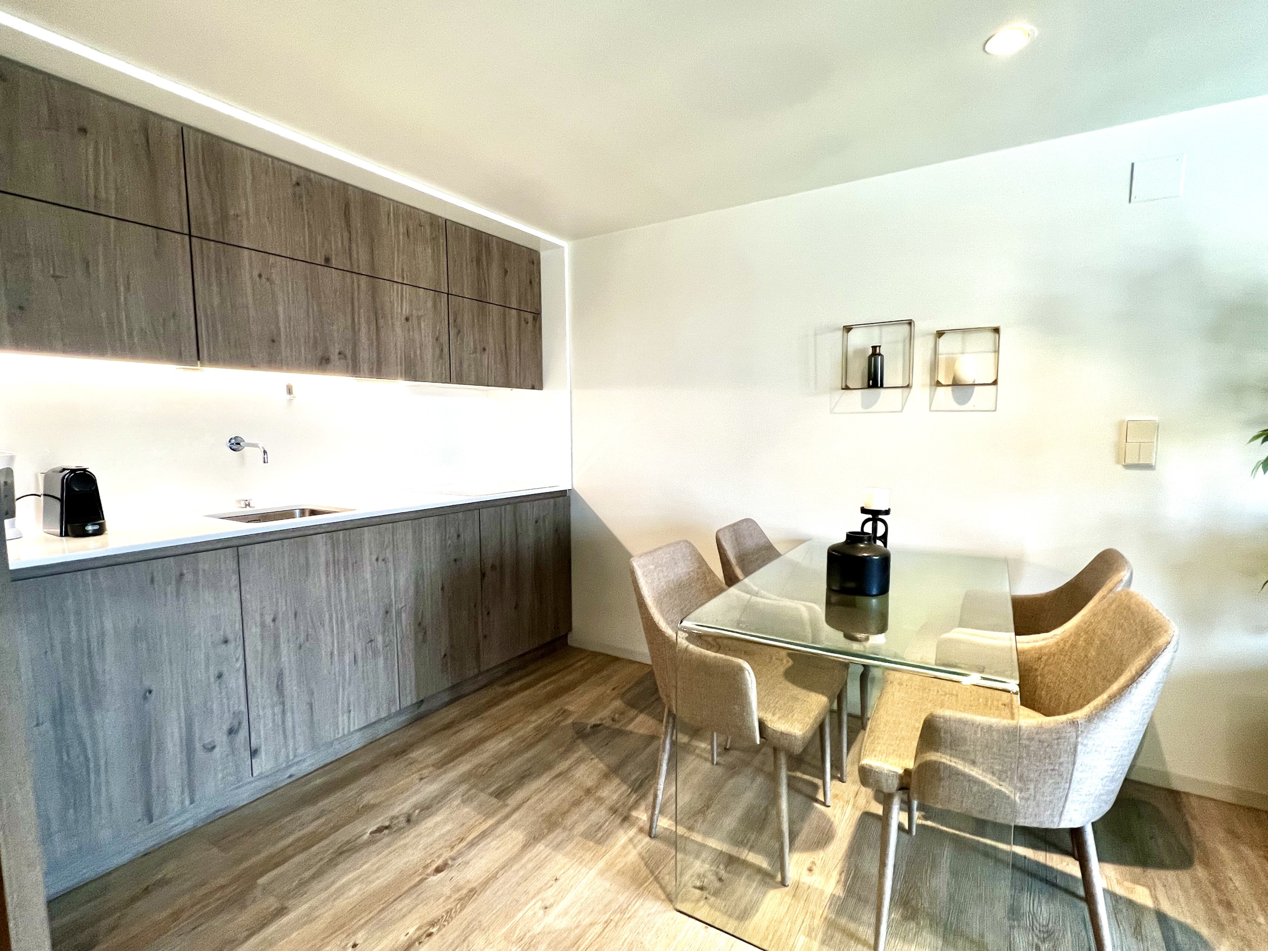 The flat is an open space with a fully equipped kitchenette with fridge-freezer, dishwasher, ceramic hob, microwave, coffee machine, toaster and electric kettle. Next to the kitchen is a dining table for four.